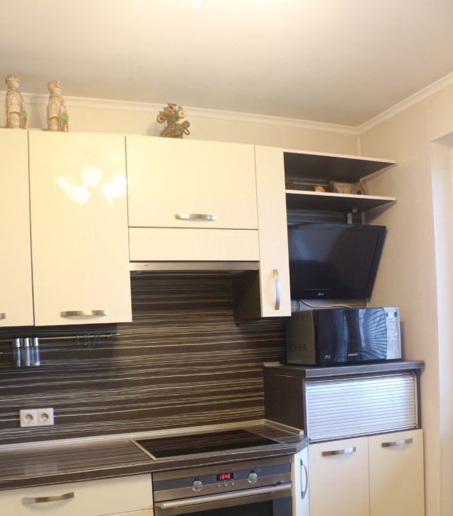 Кухня оборудована встроенным кухонным гарнитуром и современной кухонной техникой: