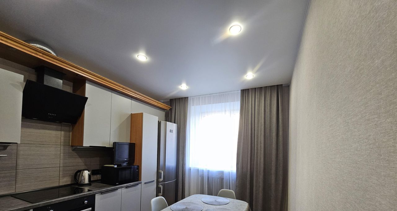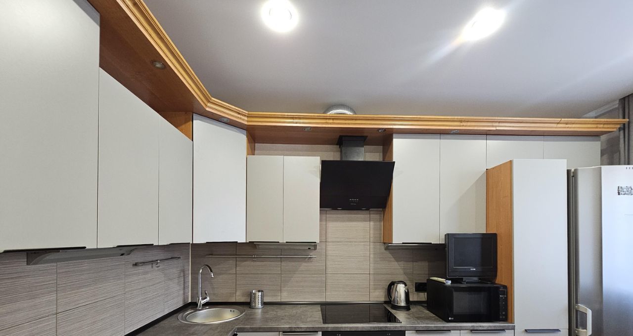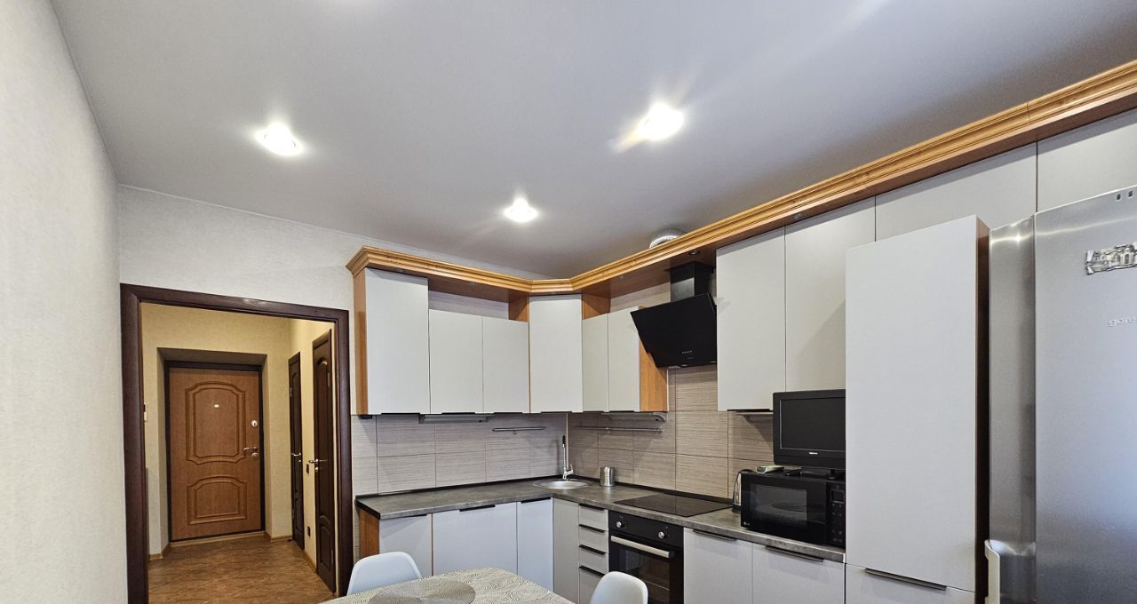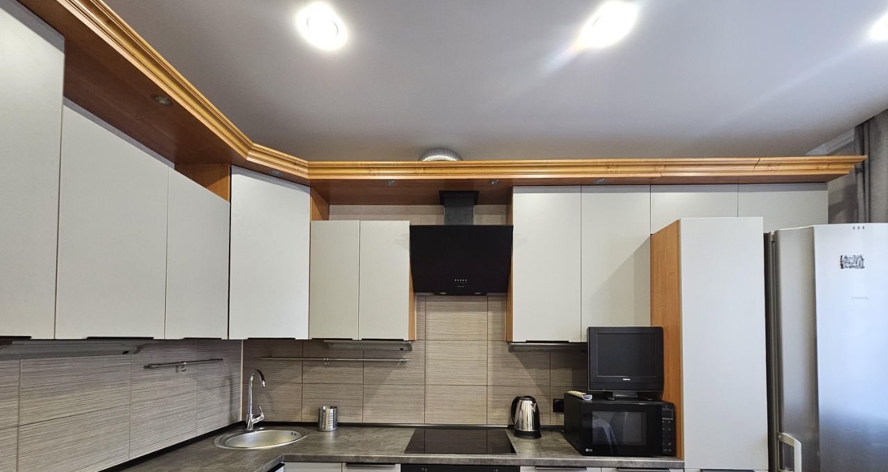 На кухне установлен встроенный кухонный гарнитур. Есть вся необходимая бытовая техника.