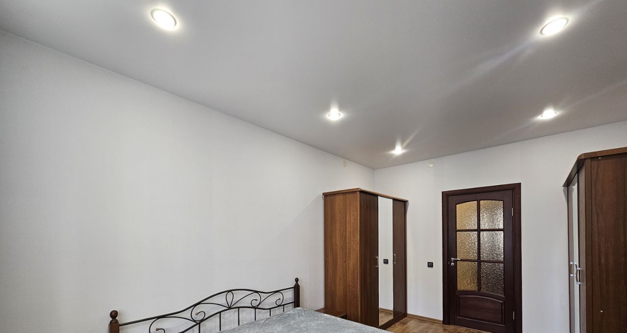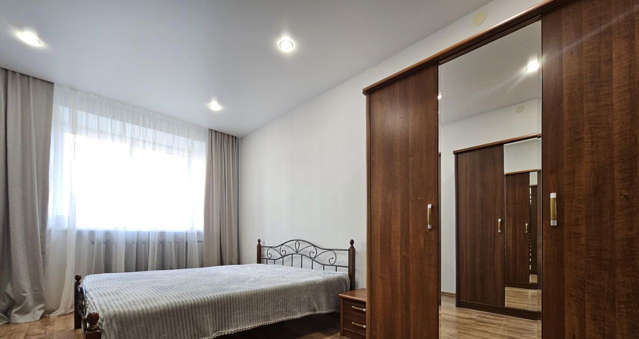 В спальне двухспальная кровать с новым матрасом, вместительный шкаф.