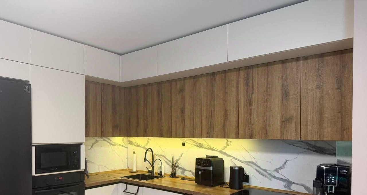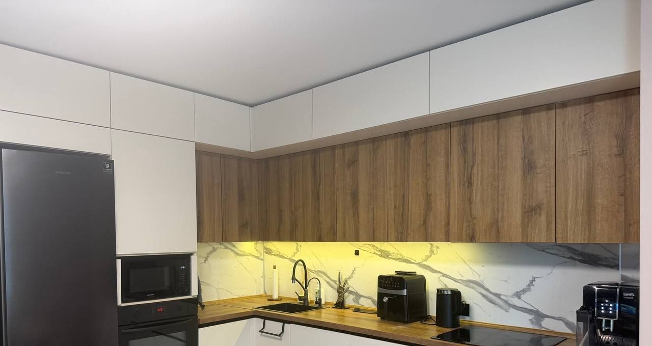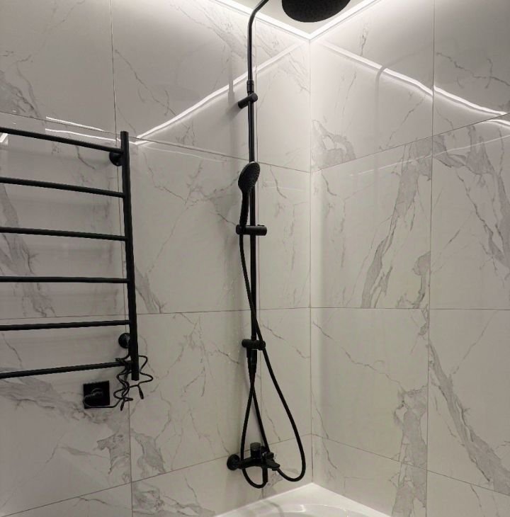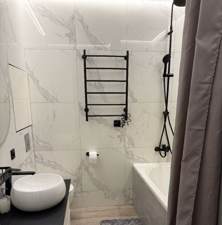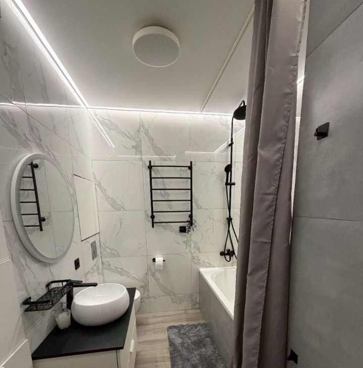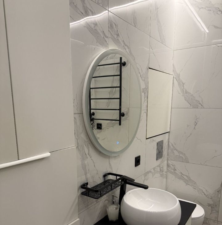 Кухня оборудована современной техникой: холодильник, варочная панель, духовой шкаф, посудомоечная машина и микроволновая печь. В ванной комнате совмещённый санузел с качественной сантехникой и стильной плиткой.