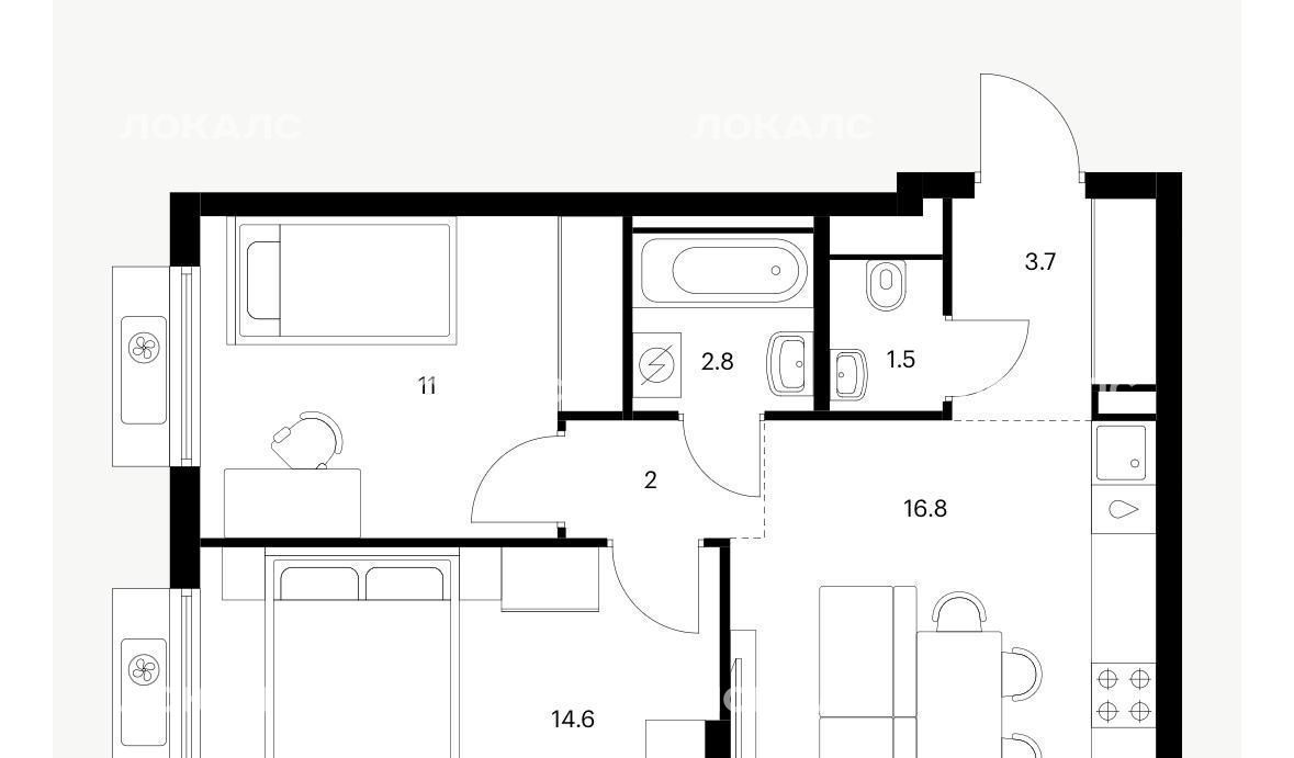 -2 ванных комнаты с санузлом-2.8 и 1,5 м²