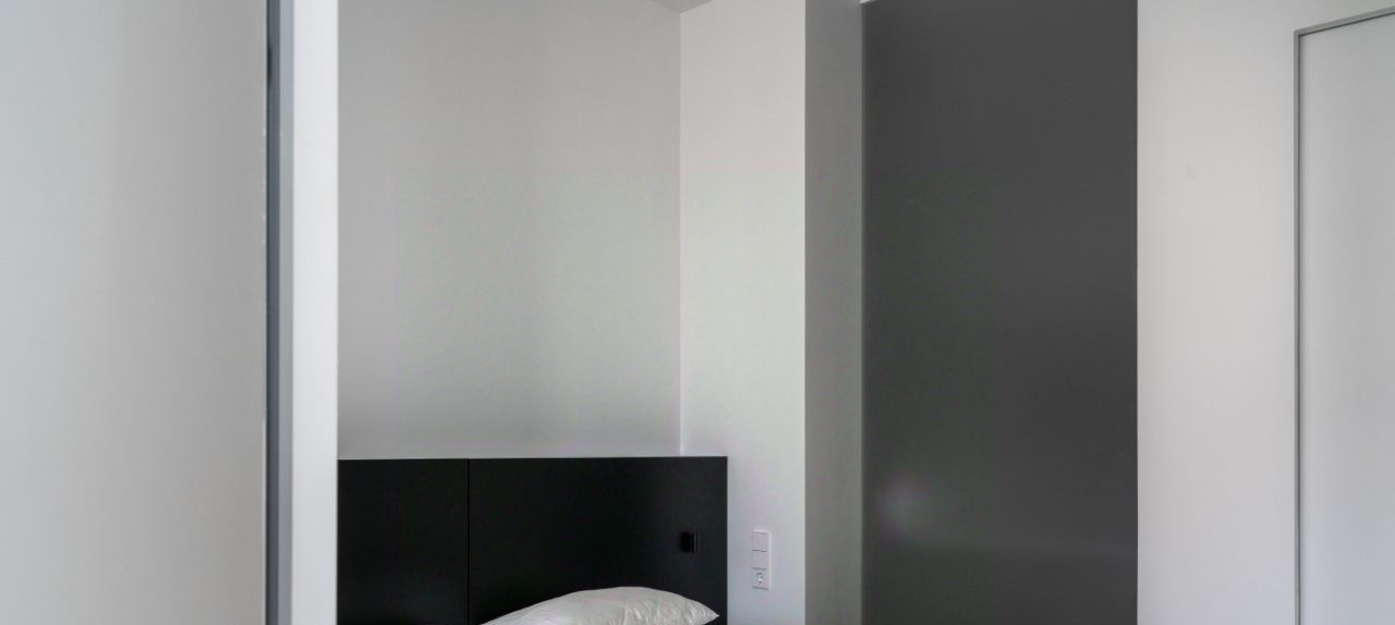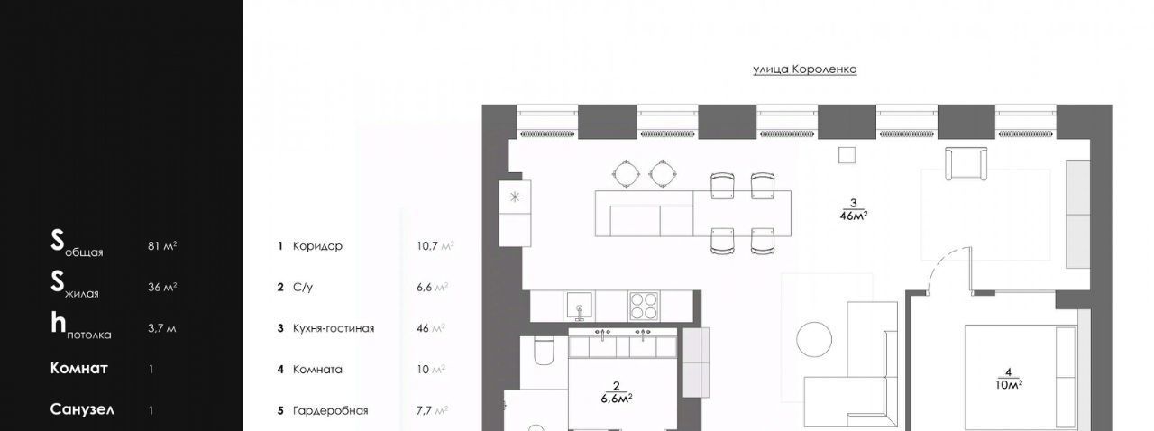Планировка с очень светлой кухней-гостиной с пятью окнами и идеальным зонированием, спальней с большой гардеробной, ванной комнатой и кладовой, компактно скрытой в прихожей.