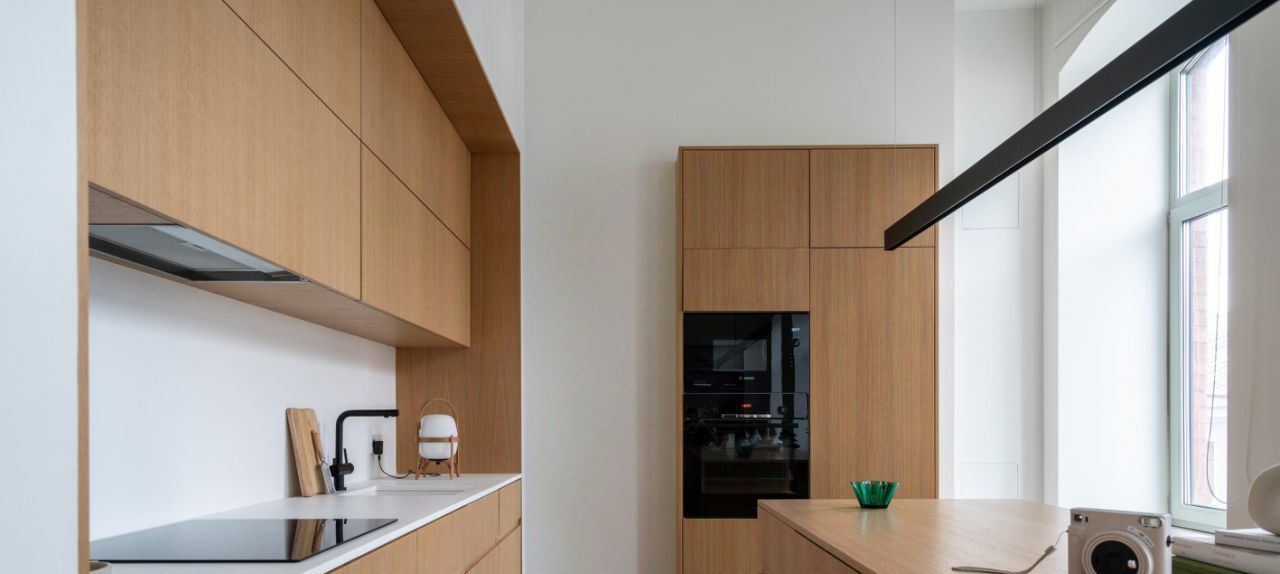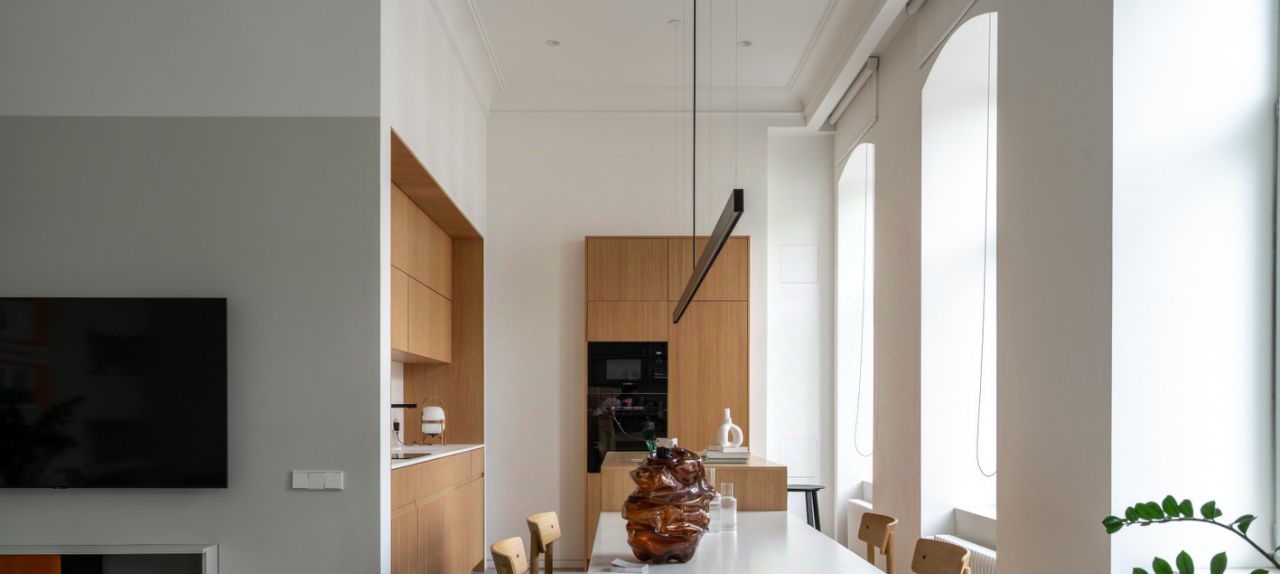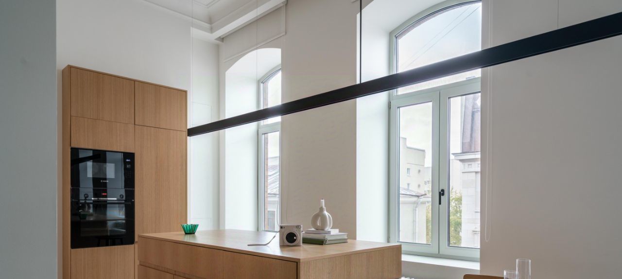 Кухня из дуба оборудована всей необходимой техникой немецкого бренда и посудой. Обогреваемые полы из итальянского керамогранита. Все в квартире продумано до мелочей, начиная от ее функциональности и заканчивая эстетическими элементами, такими как винтажная аудиосистема.