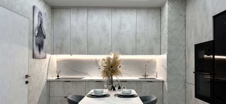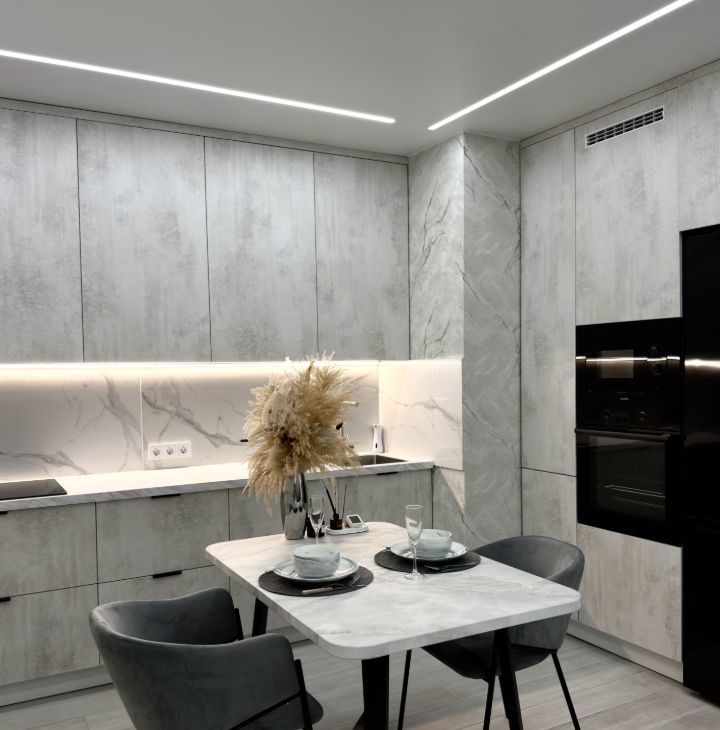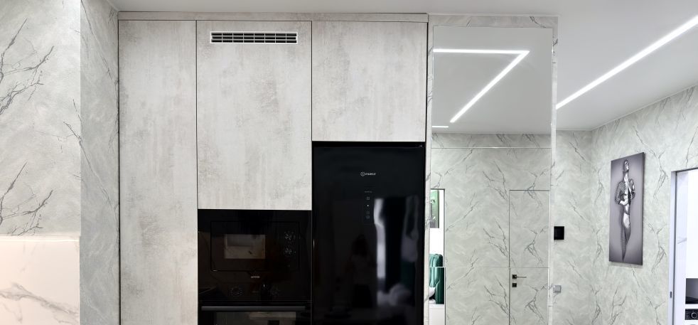 •Вся техника встроенная: холодильник, духовой шкаф, микроволновка