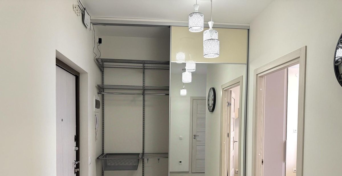 Большой шкаф-купе в прихожей с системой хранения вещей.
