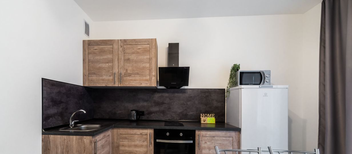 - Кухонный гарнитур с варочной поверхностью, холодильником, чайником, духовым шкафом, набором посуды для готовки и сервировки
