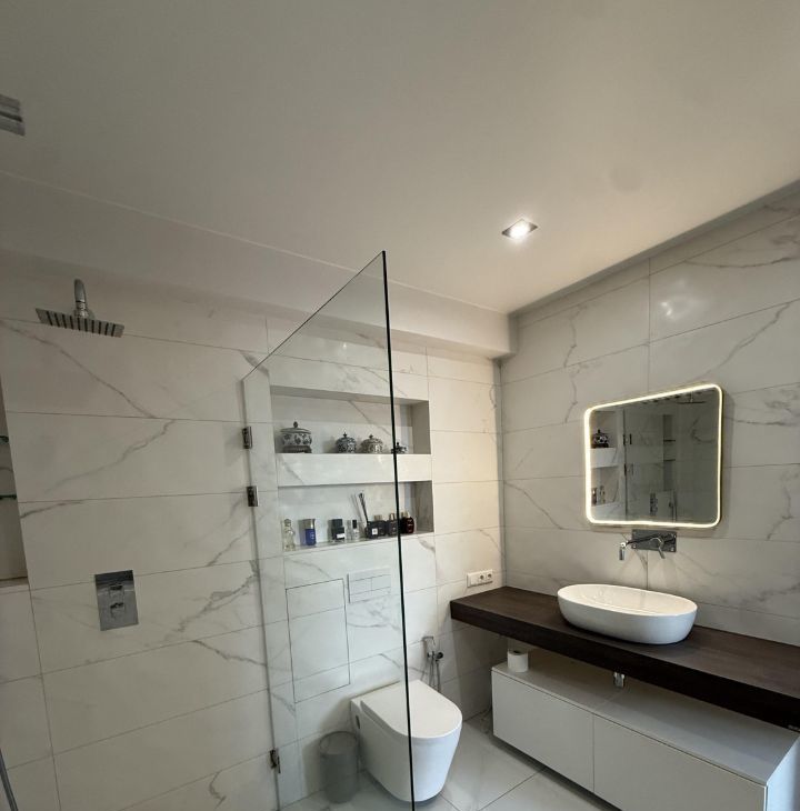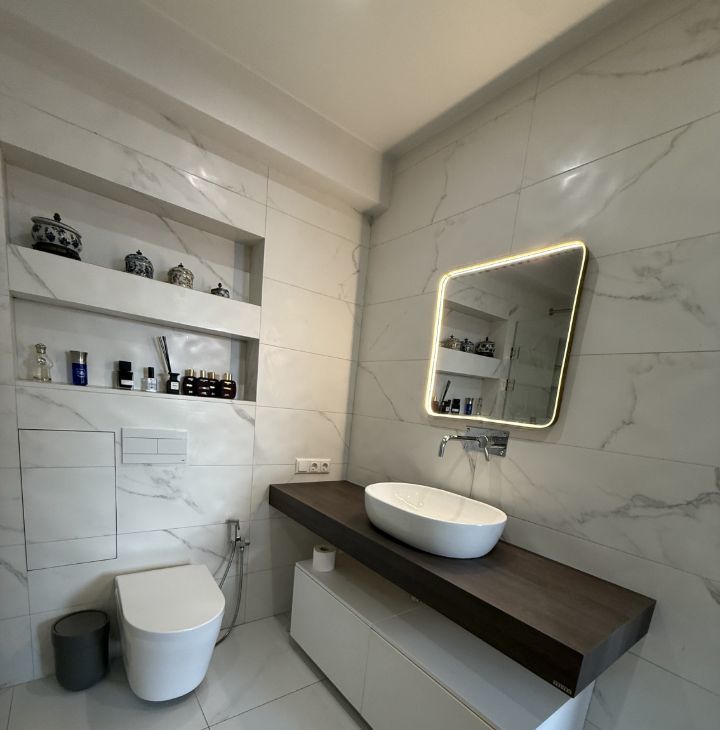 -Ванная комната совмещённая, пол с подогревом, оформлена в современном стиле с качественной сантехникой, стиральная машинка с сушкой.
