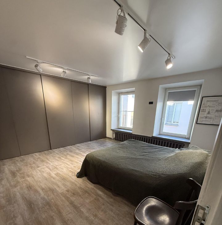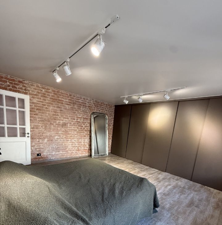 -В спальне минималистичная обстановка , включая шкаф во всю стену и кровать.