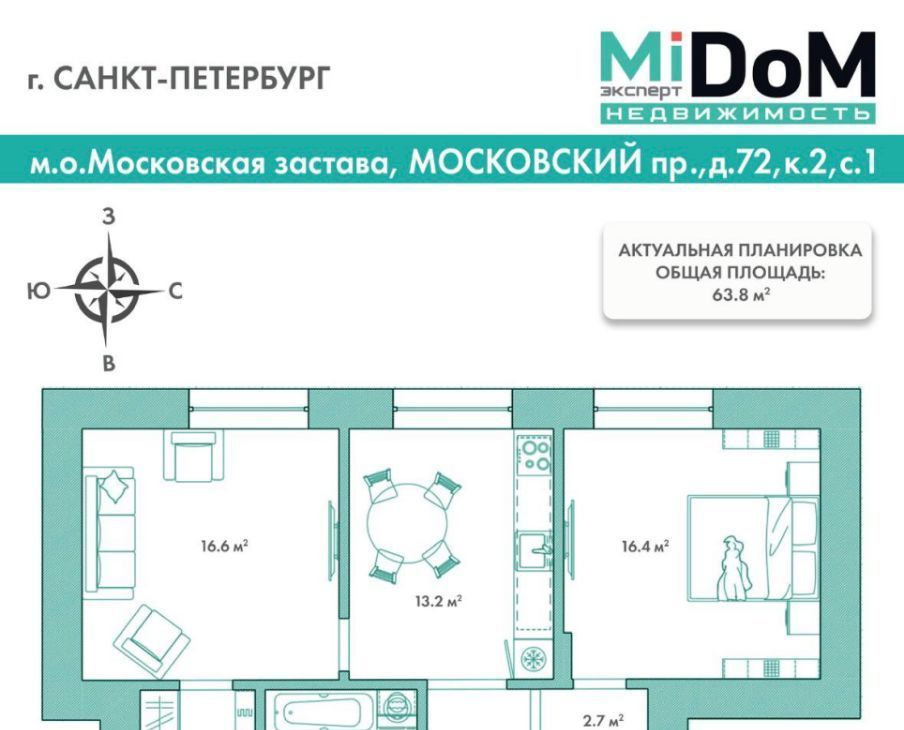 2-к кв. Санкт-Петербург Московский просп., 72к2 (63.8 м²)