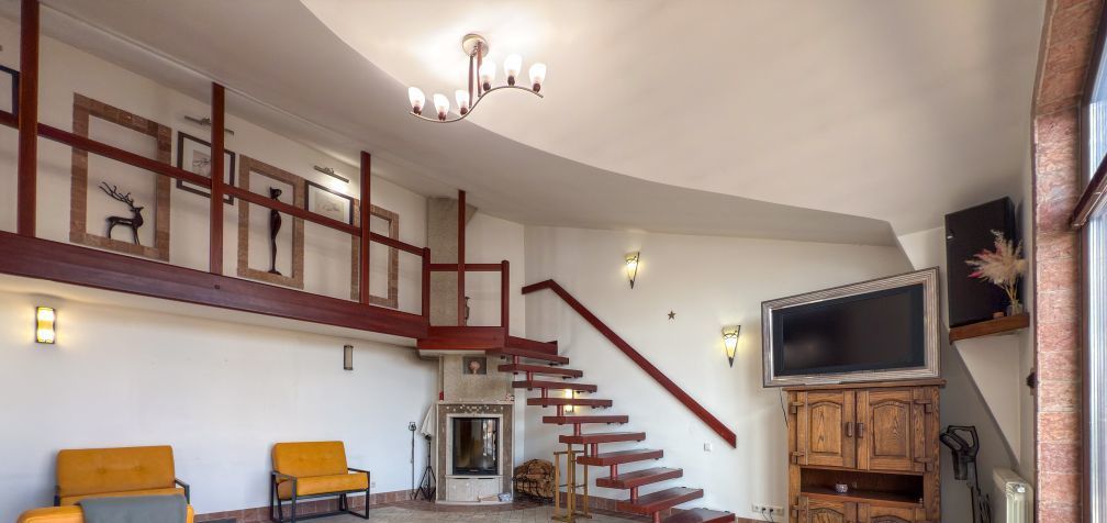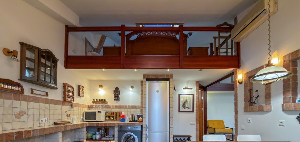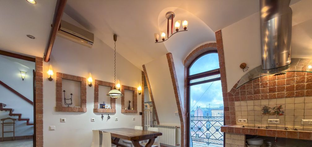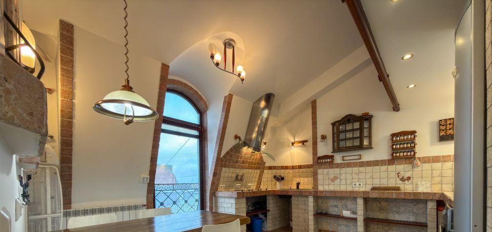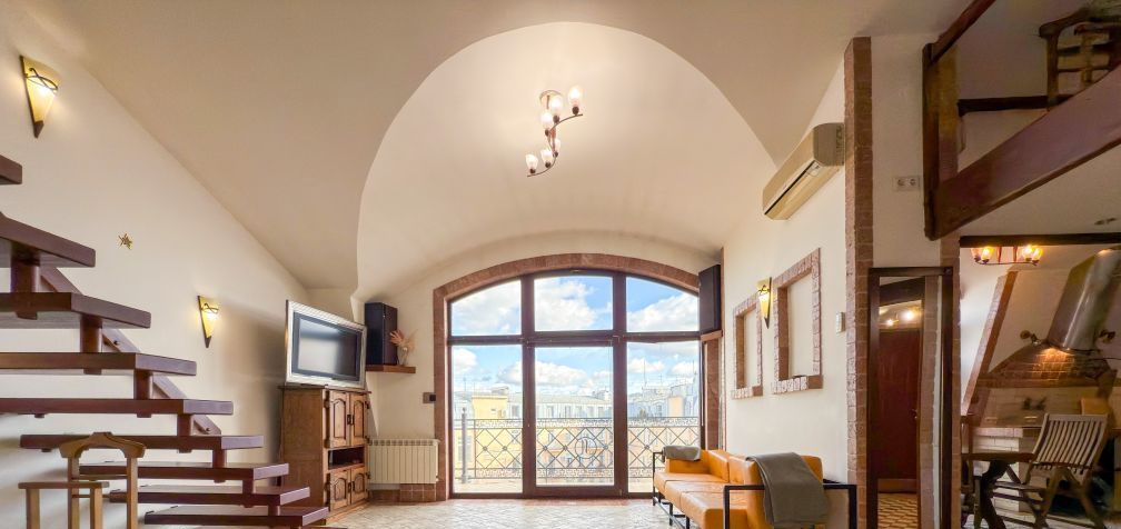 Квартира очень просторная и светлая, оснащенная современной бытовой техникой, стильной мебелью, оригинальным освещением, удобной спальной зоной на втором этаже с большой кроватью, теплым полом по всему первому этажу и действующим камином. Есть кондиционер.