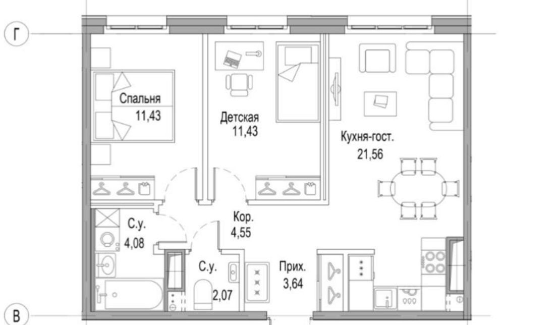 • Детская/кабинет 11.43 м² — функциональная комната для ребенка или работы.