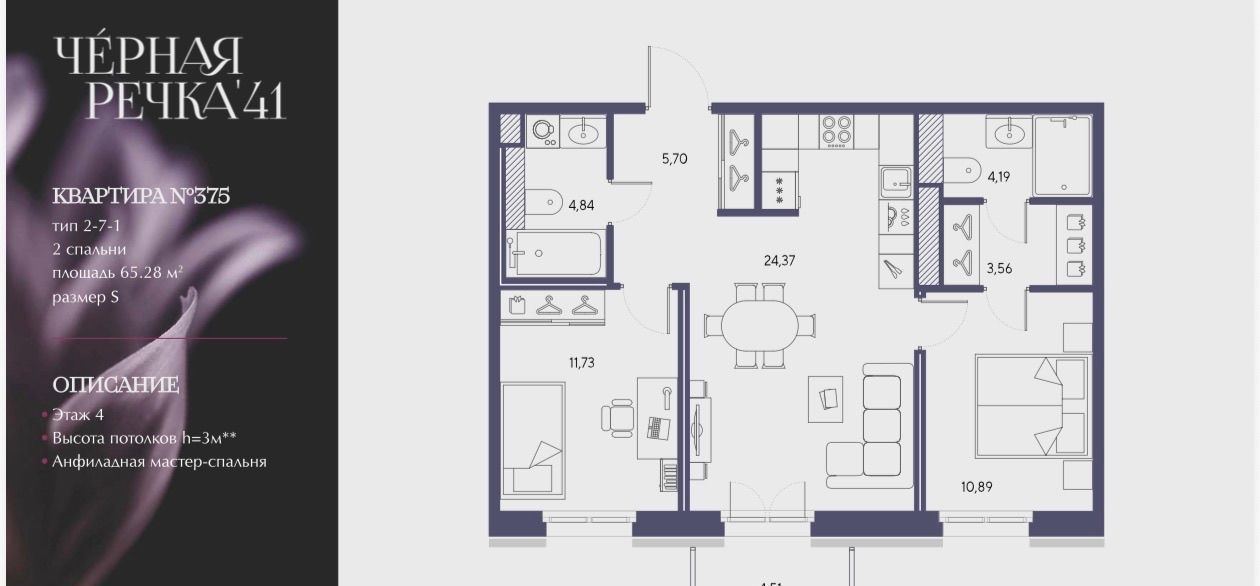 2-к кв. Санкт-Петербург наб. Черной речки, 35 (65.3 м²)