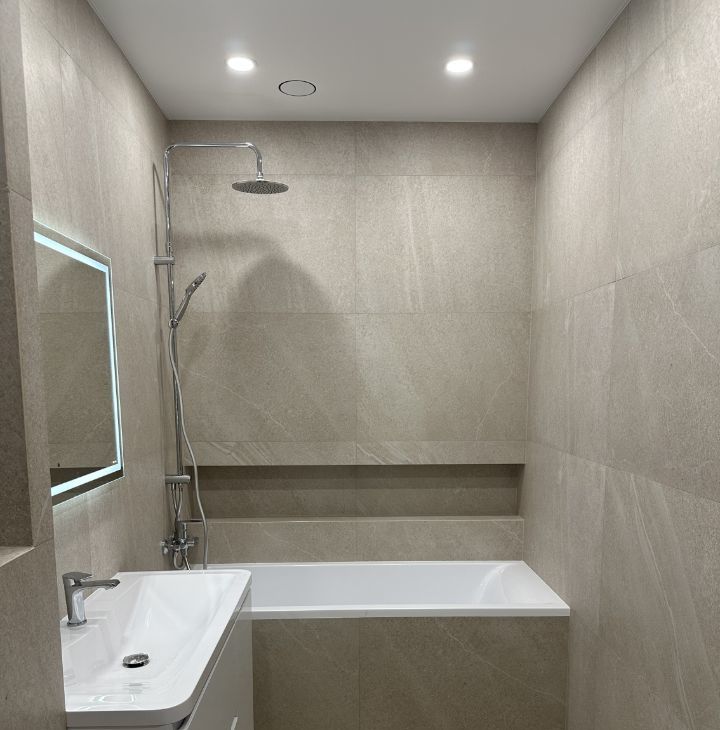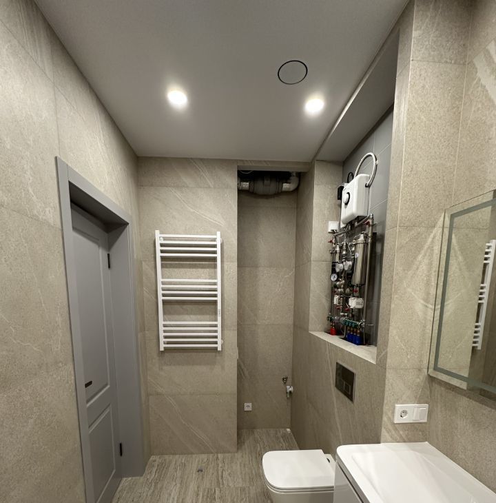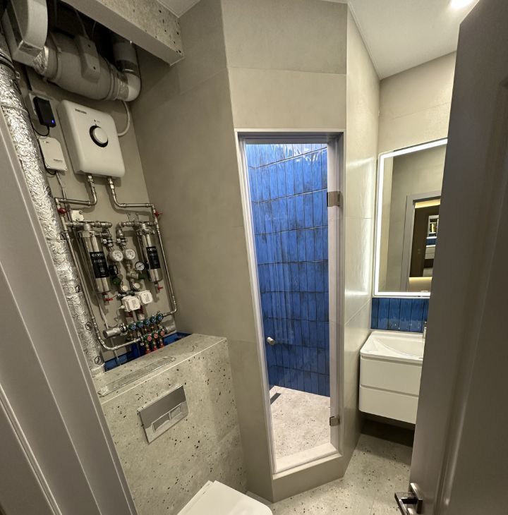 2 санузла с ВЫСТРОЕННОЙ душевой, и ванной. Продумано всё до мелочей. Вентиляция. Кондиционер. Фильтры на очистку воды. Проточные водонагреватели. Электрика:раздельный фоновый и основной свет, деление по зонам. Тёплый пол в коридоре , кухне (исключен кусочек для ковра перед телевизором), санузлы. Всё с терморегуляторами. Новая кухня на заказ. Проведен интернет. Розетки под телевизор, есть куда спрятать провода.