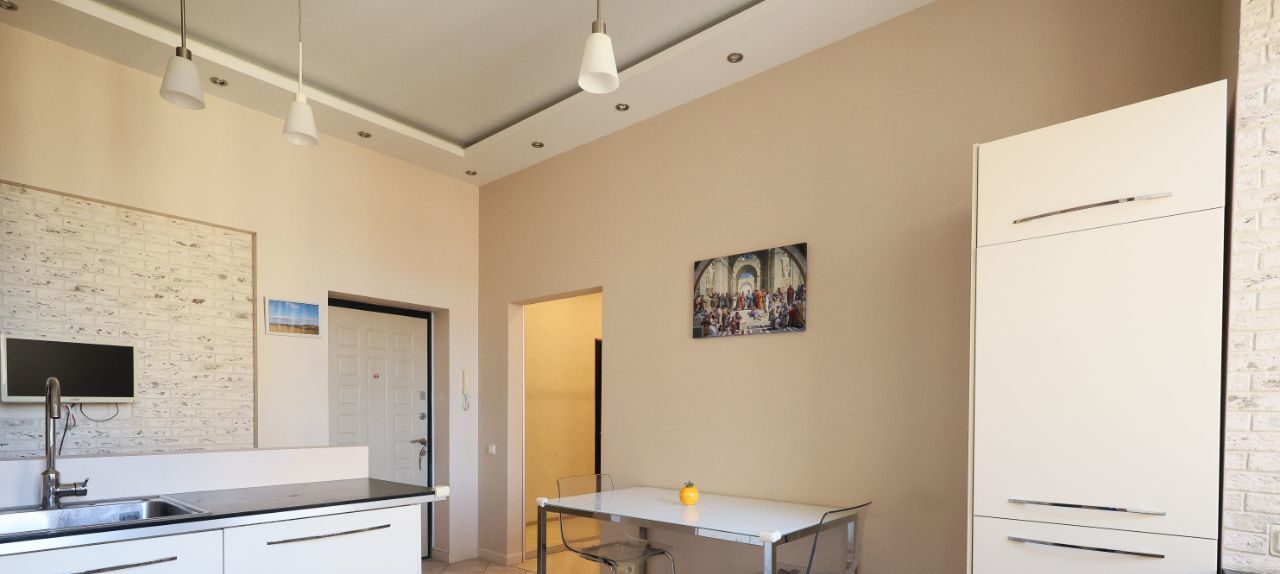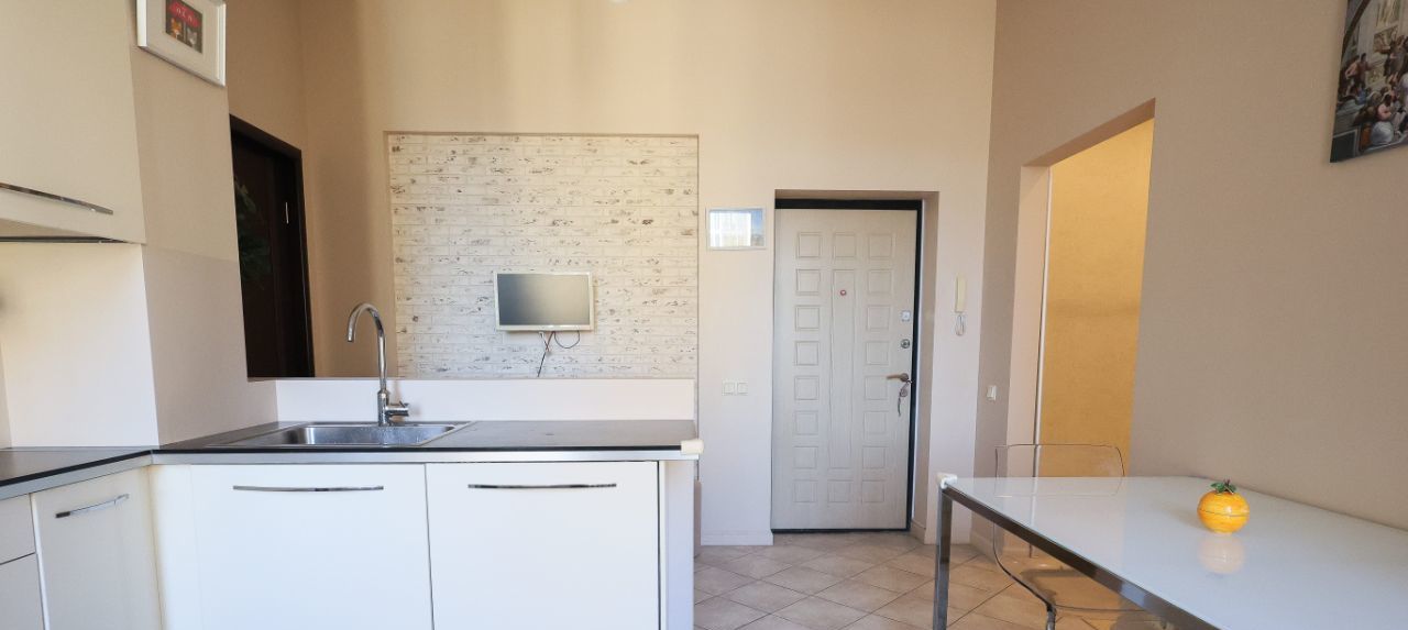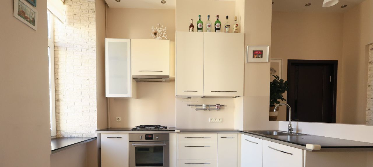 Кухня оборудована встроенной техникой (газовая плита, электрическая духовка, двухкамерный холодильник, посудомоечная машина). В ванной - стиральная машина и водонагреватель.