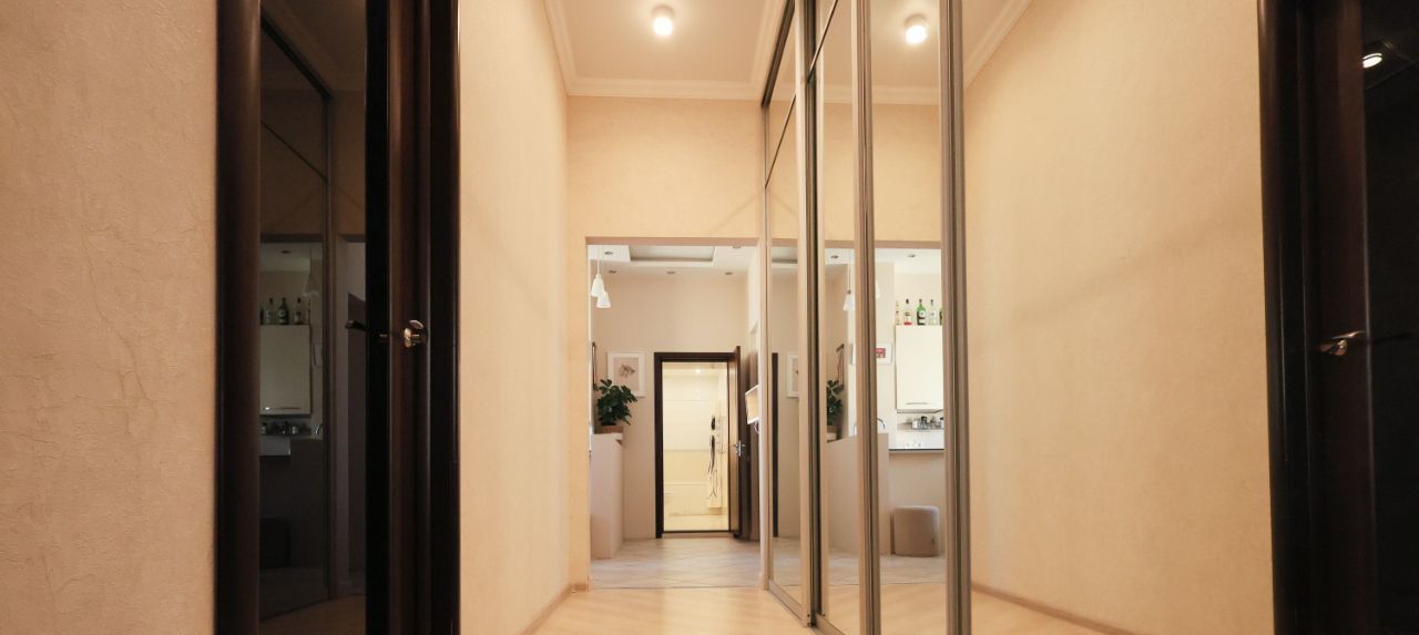 Квартира двухкомнатная, общей площадью 55,4кв.м., находится на шестом этаже дома 1914 года постройки, стоящего непосредственно на набережной канала Грибоедова.