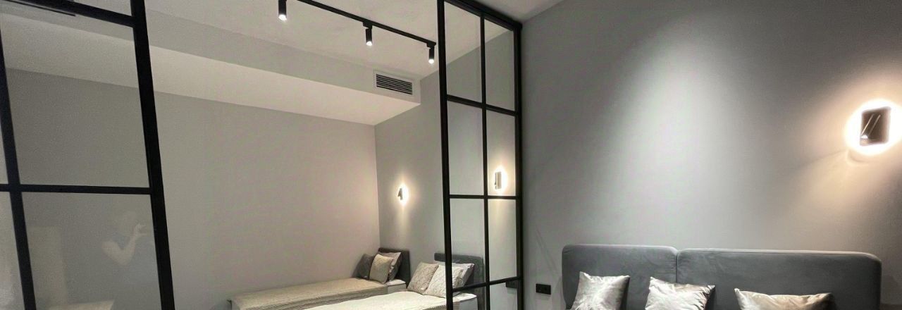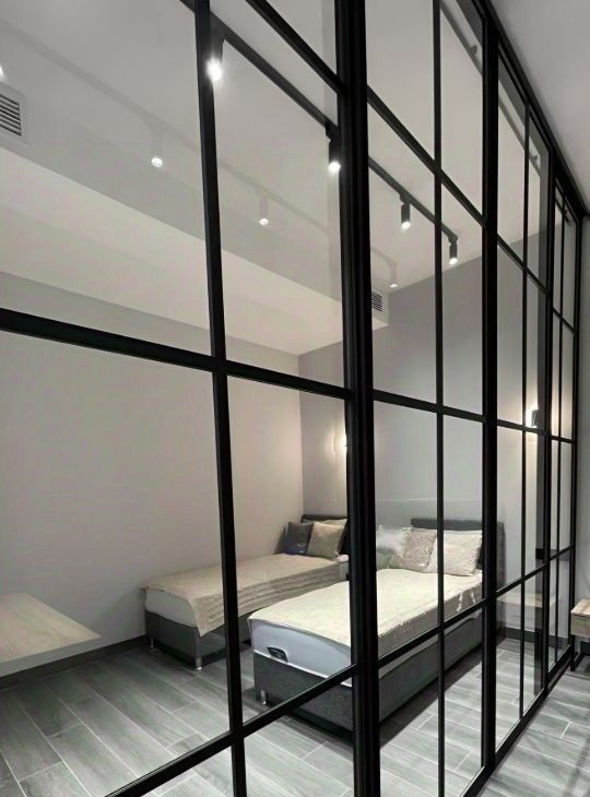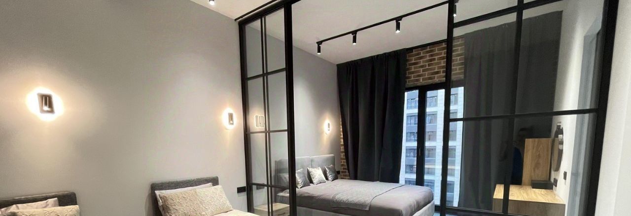 так же квартира имеет две изолированные спальни , разделенные лофт перегородкой для приватности.Гардеробная система в стиле лофт. Диван раскладывается для доп спальных мест (матрасы Askona Serta).