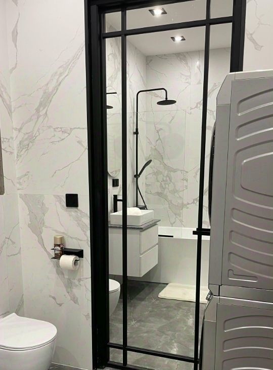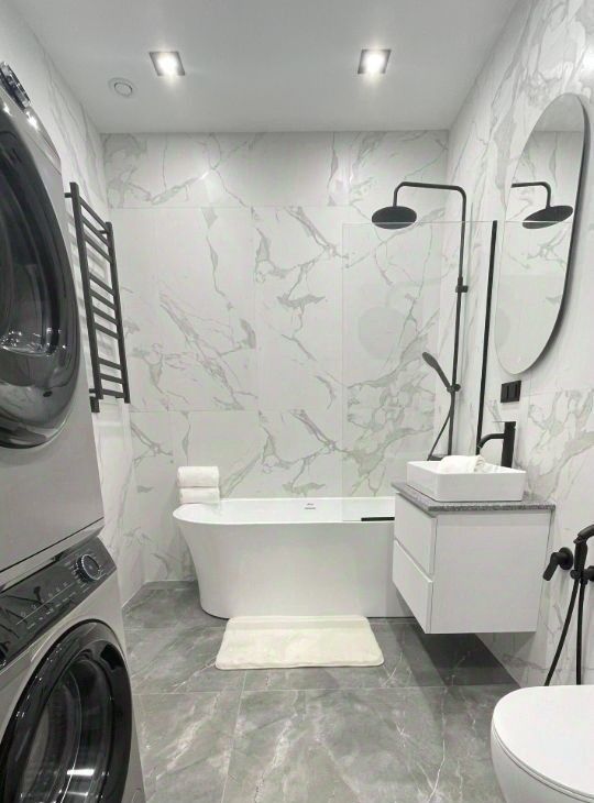 стиральной и сушильной машиной , отдельно стоящей ванной.