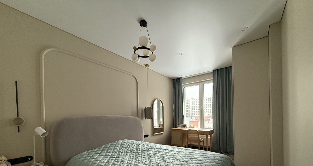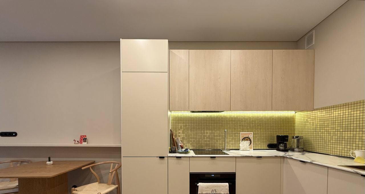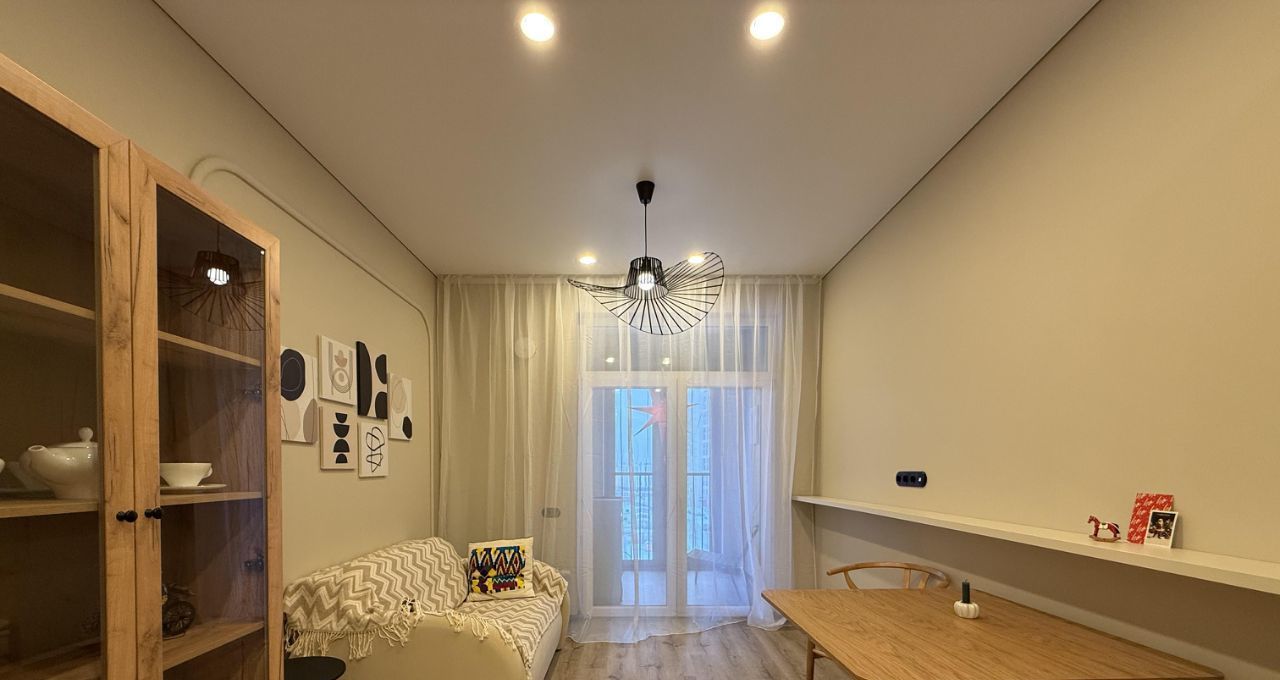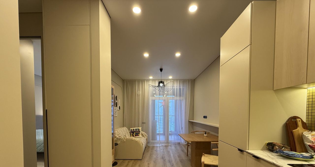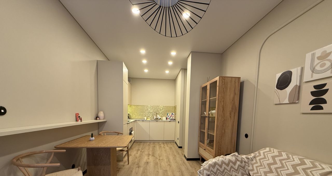 - функциональная просторная кухня-гостиная со всей необходимой техникой и с большим панорамным балконом, уютная спальня с рабочей зоной;