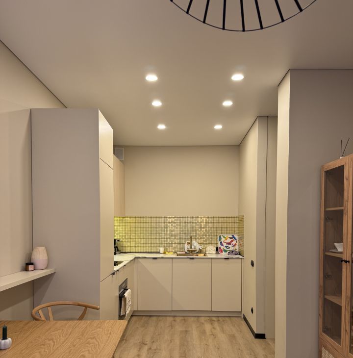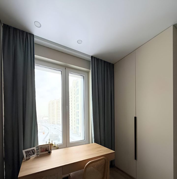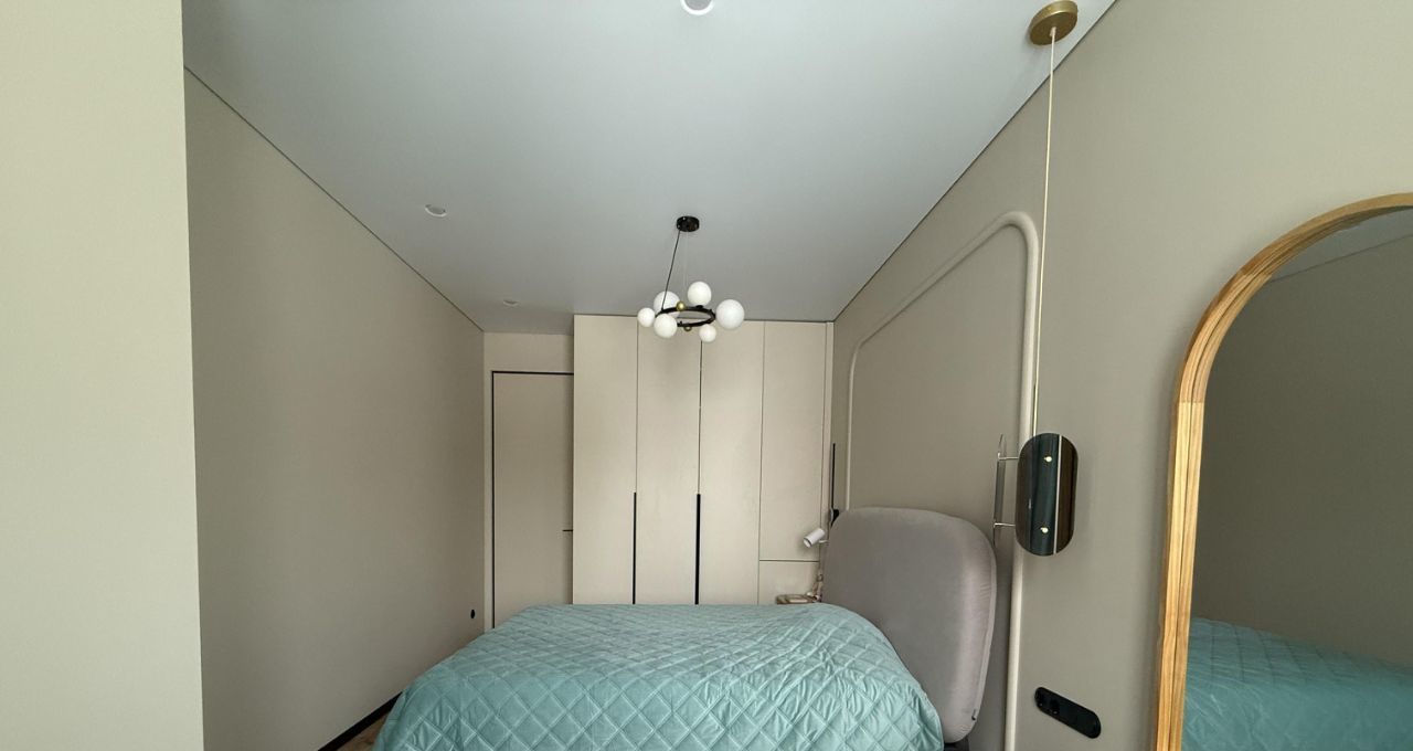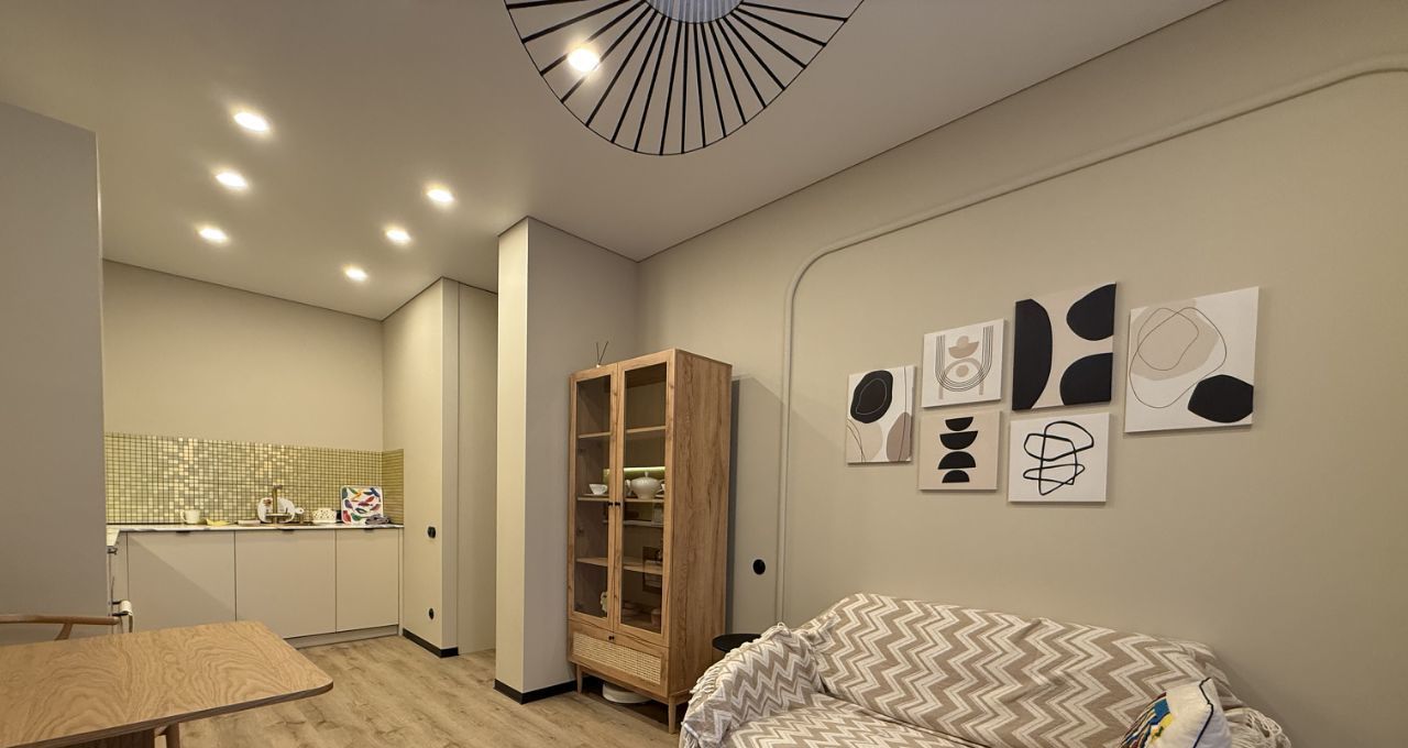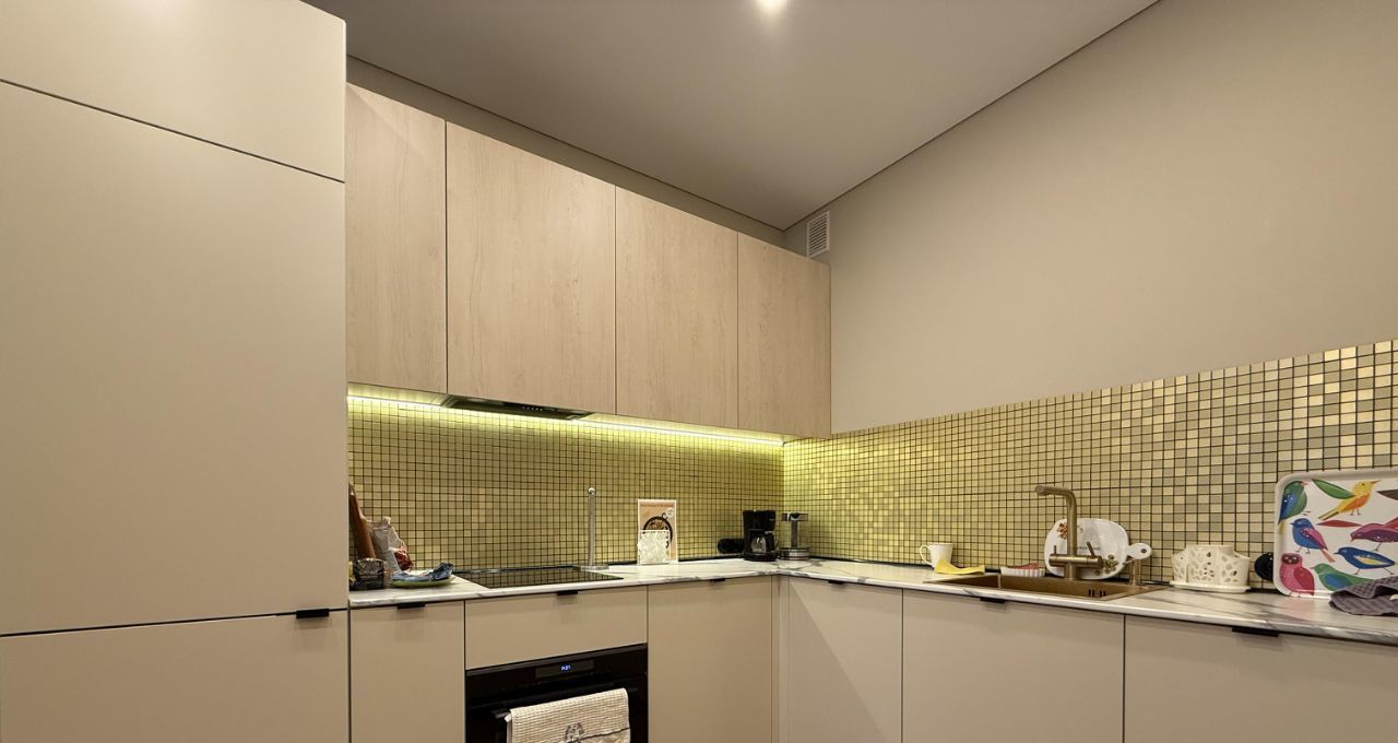 - функциональная просторная кухня-гостиная со всей необходимой техникой и с большим панорамным балконом, уютная спальня с рабочей зоной;
