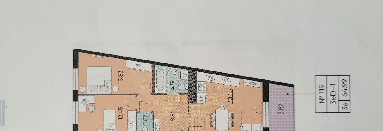 Планировка: евротрешка (просторная кухня-гостиная +2 спальни).