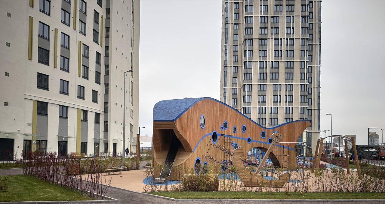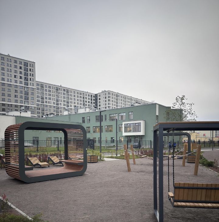 Во дворе дома расположены школа и детский сад. В комплексе есть все необходимые магазины, фитнес центр.
