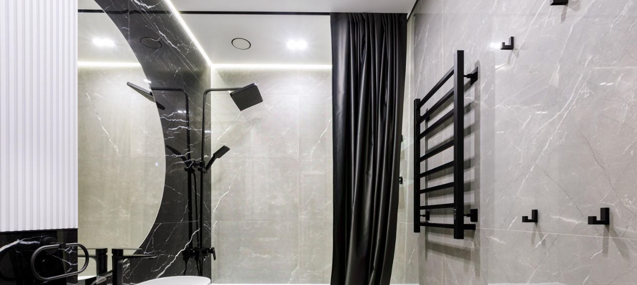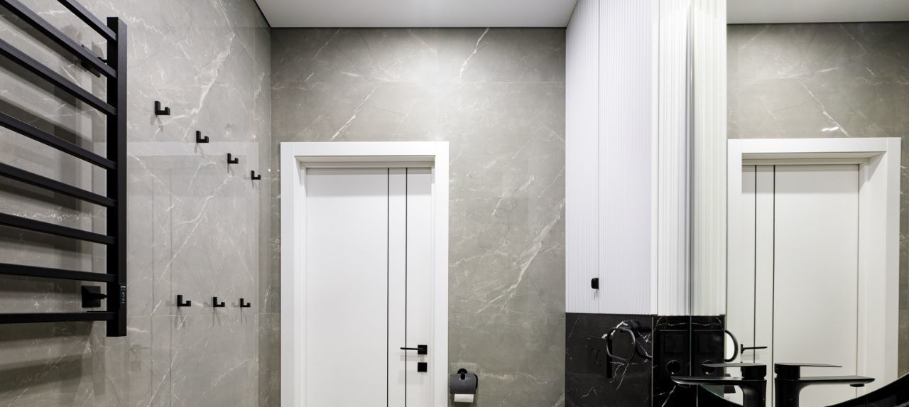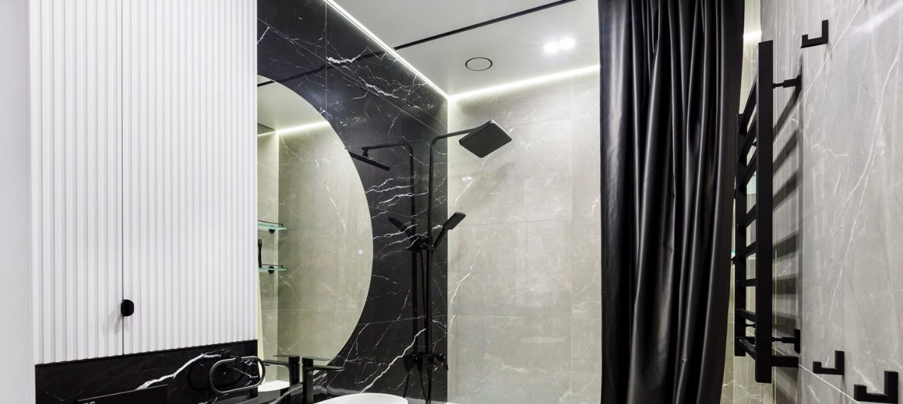 Санузел: Современный, совмещенный, выполненный в единой дизайнерской концепции.