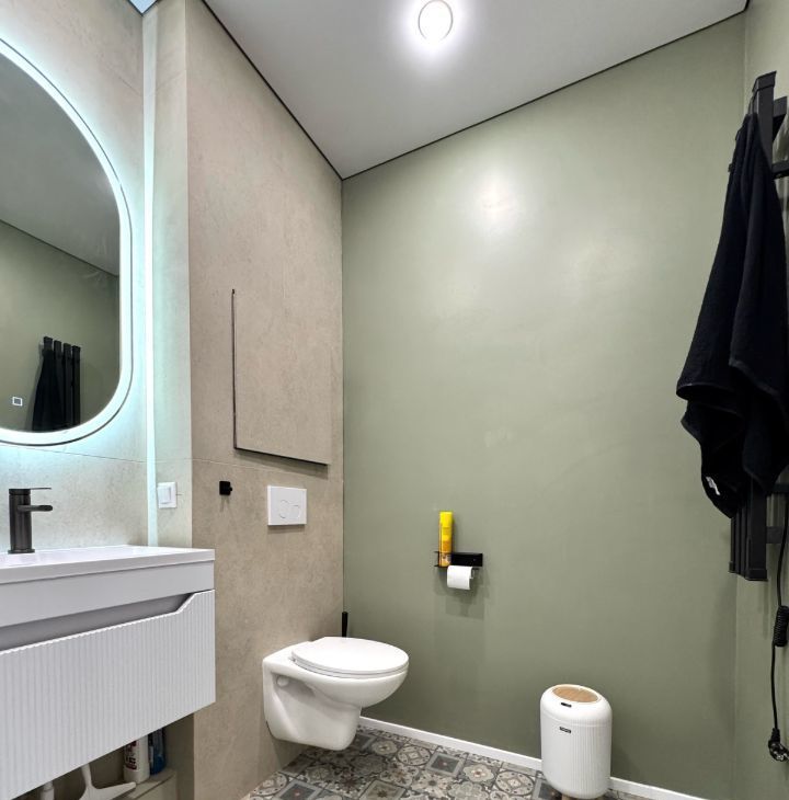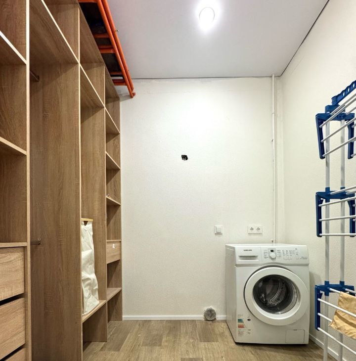 В квартире предусмотрена большая постирочная зона, совмещённая с гардеробной. Это функциональное решение позволяет удобно скрыть все бытовые вещи и сохранить чистоту визуального пространства.