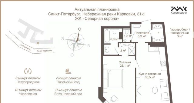 Арт. 119175524 Абсолютно новая изысканная квартира в ЖК "Северная корона" с прямым видом на реку Карповку 73 кв.м. готова для длительного комфортного проживания.