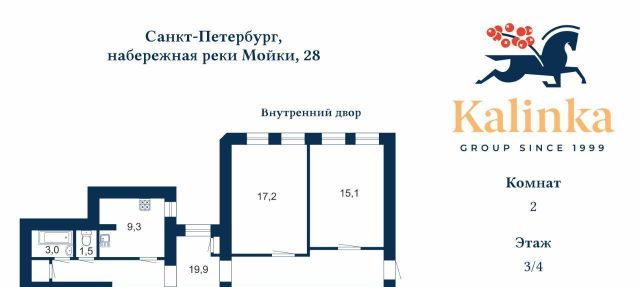 Продается уютная квартира в историческом центре Санкт-Петербурга по адресу: набережная реки Мойки, 28. Квартира площадью 66 кв. м расположена на третьем этаже пятиэтажного кирпичного дома. Высокие потолки 3.05 метра и окна, выходящие во двор, создают ощущение простора и уюта.
