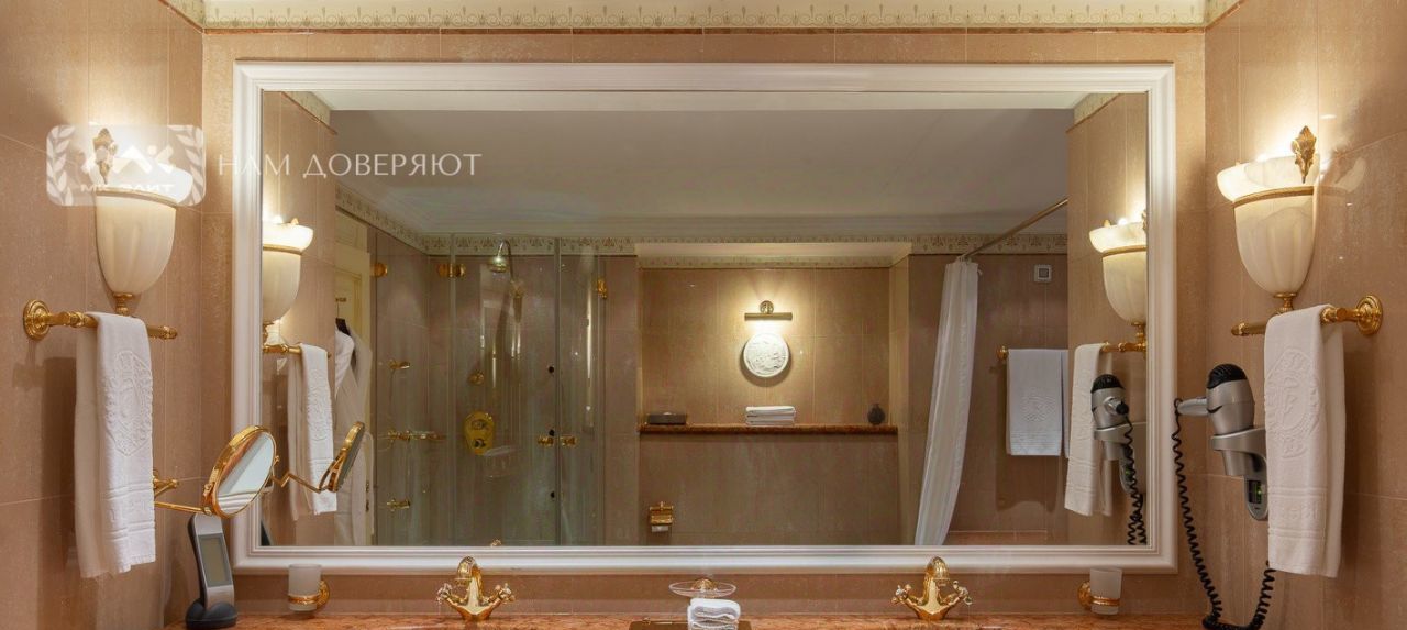 В отделке использованы эксклюзивные материалы: обои из шелковой ткани, оникс, мрамор, винтажная мебель.