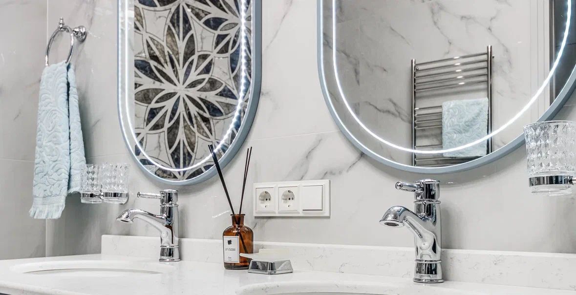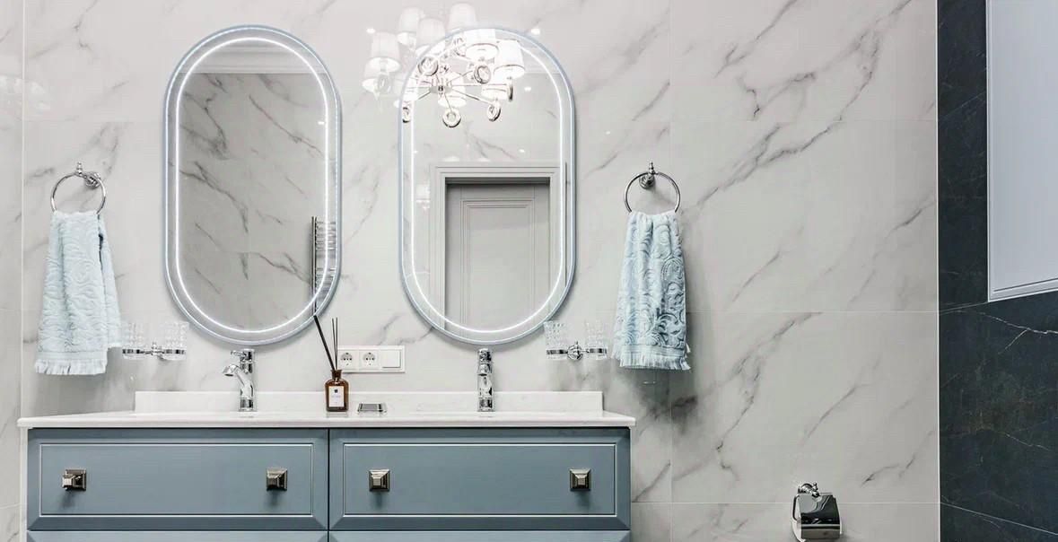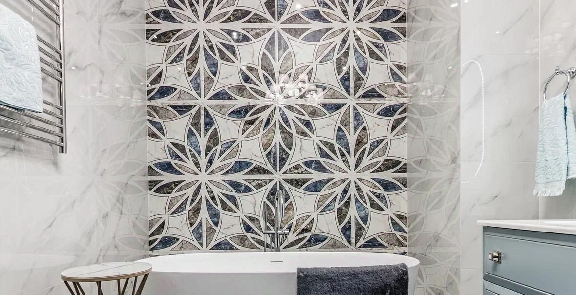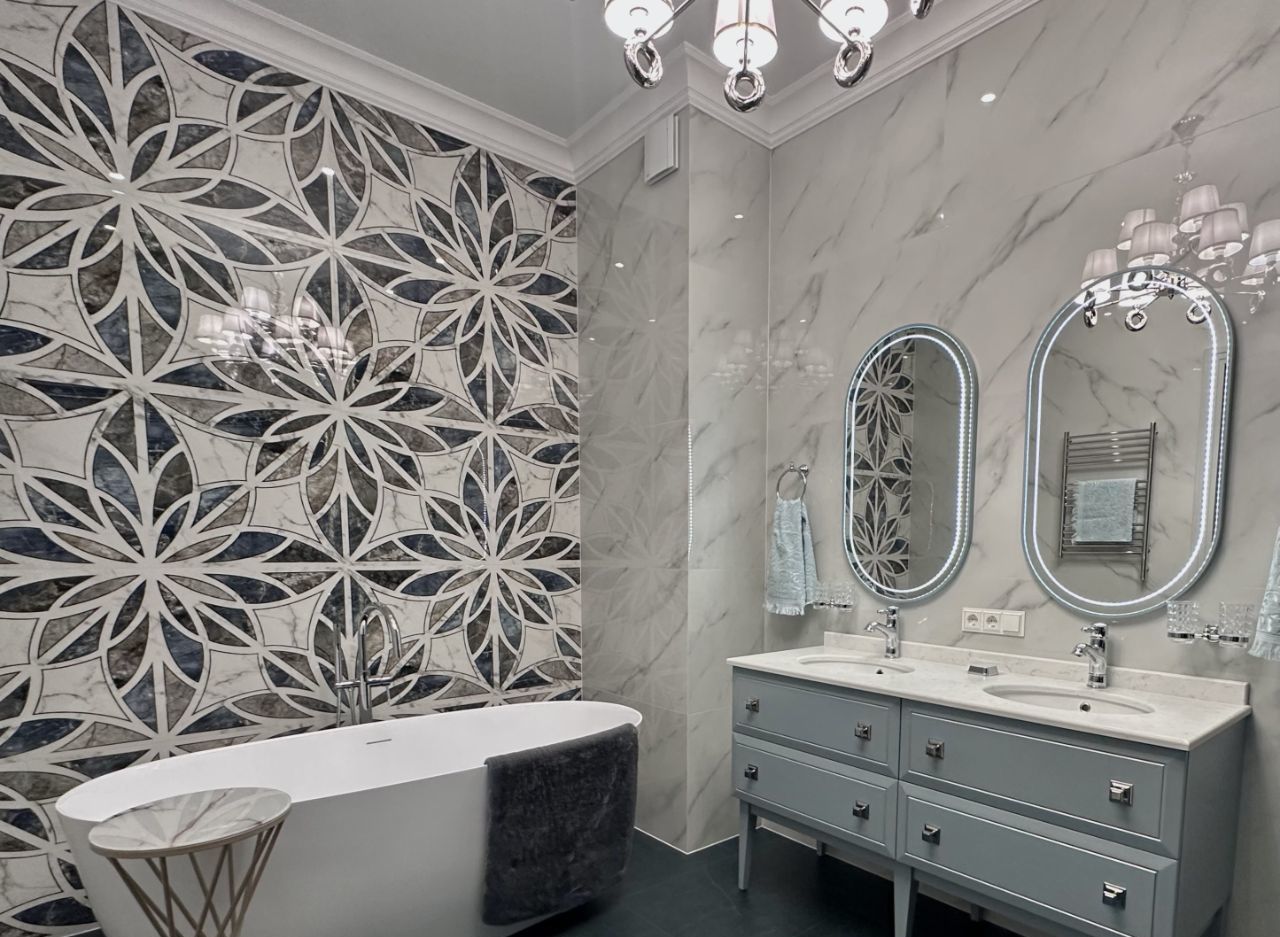 Великолепная ванная комната площадью 10 кв.м имеет душевую зону и отдельно стоящую ванну.