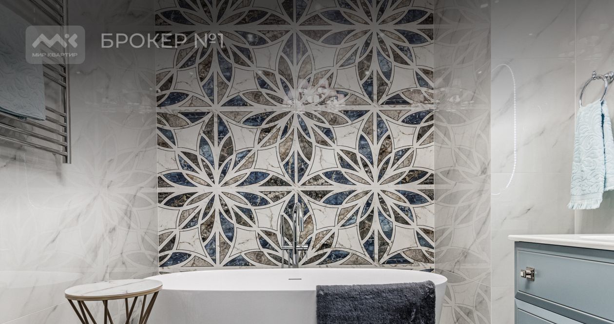 Великолепная ванная комната площадью 10 м2 имеет душевую зону и отдельно стоящую ванну.
