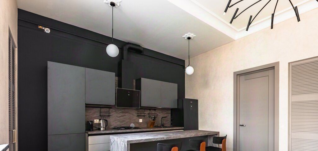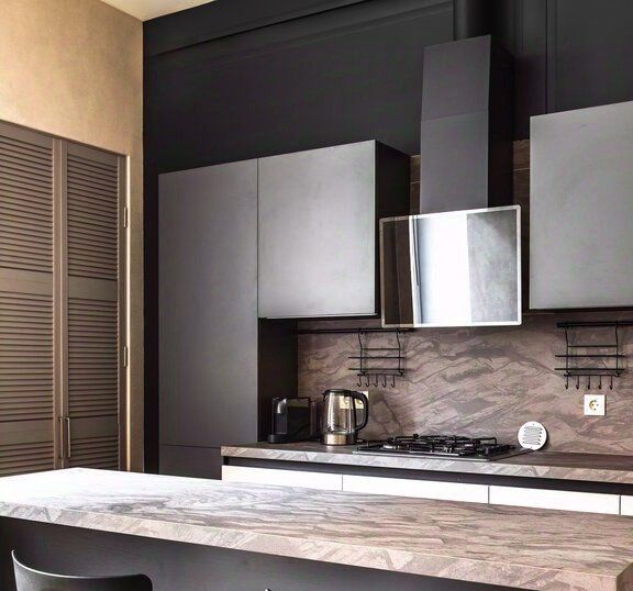 Кухня оснащена современной техникой, включая холодильник, духовой шкаф, посудомоечную машину, вытяжку, сенсорную плиту. Большой удобный диван.