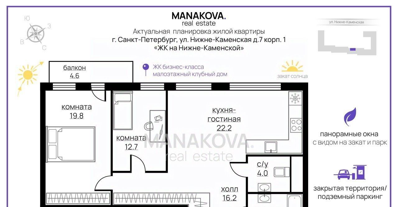 малоэтажный дом бизнес-классана этаже всего 3 квартирызакрытая охраняемая территориявидеонаблюдение по всему периметру2 поста охраныподземная, многоуровневая и наземная парковка