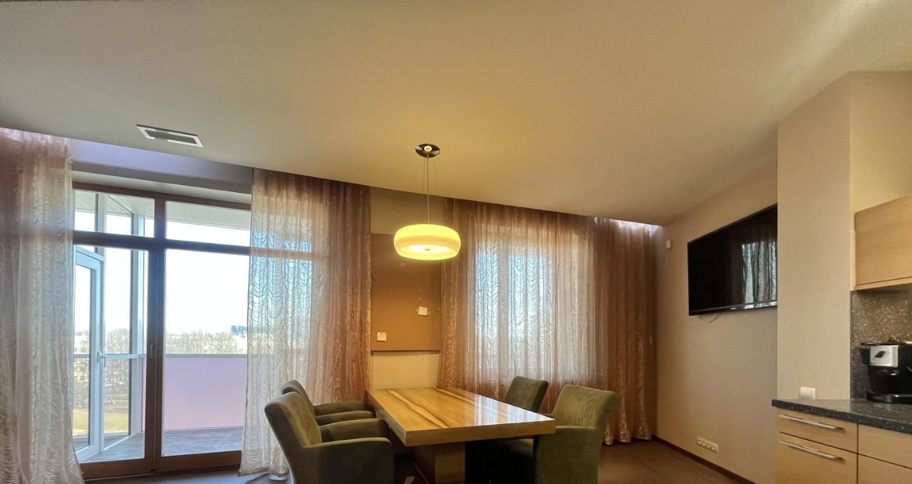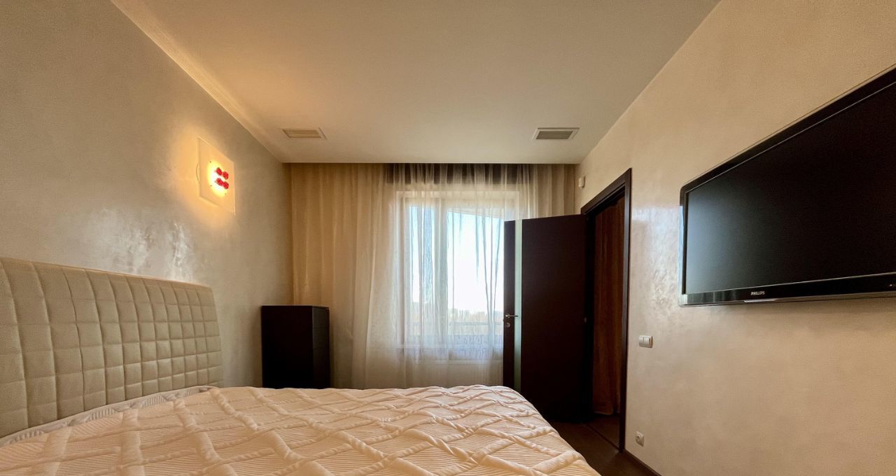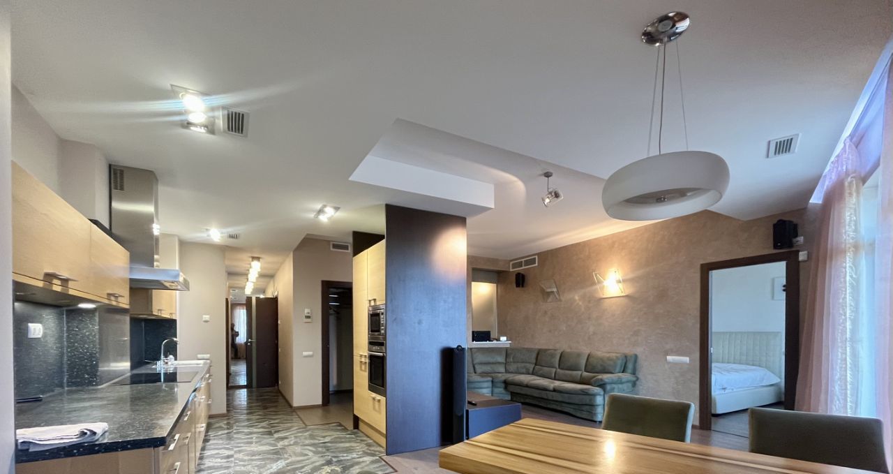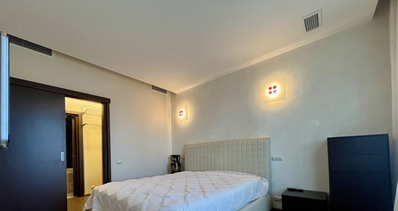 В гостиной установлен телевизор и удобный диван, а также обеденный стол с креслами. Из окон открывается вид на городские пейзажи. В спальне большая кровать и вместительные шкафы и оборудованная гардеробная.