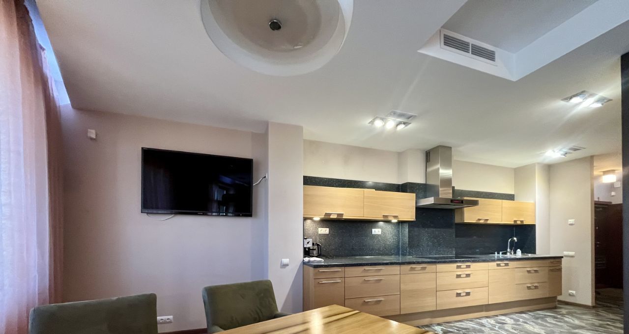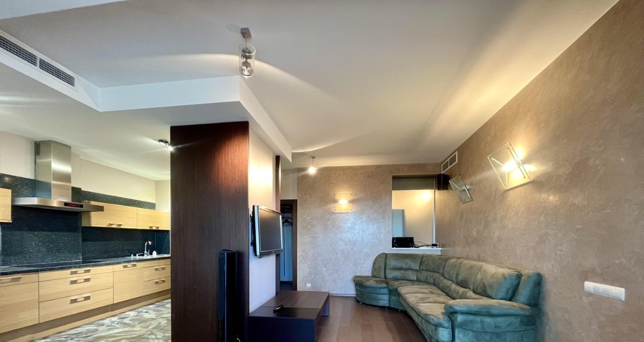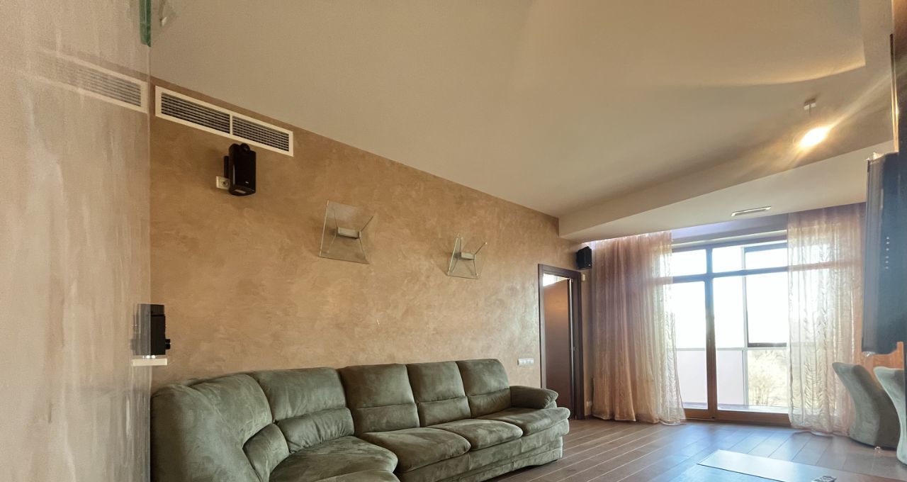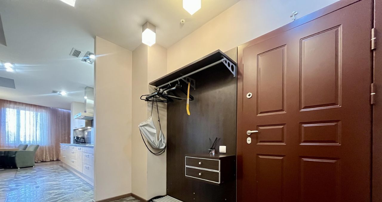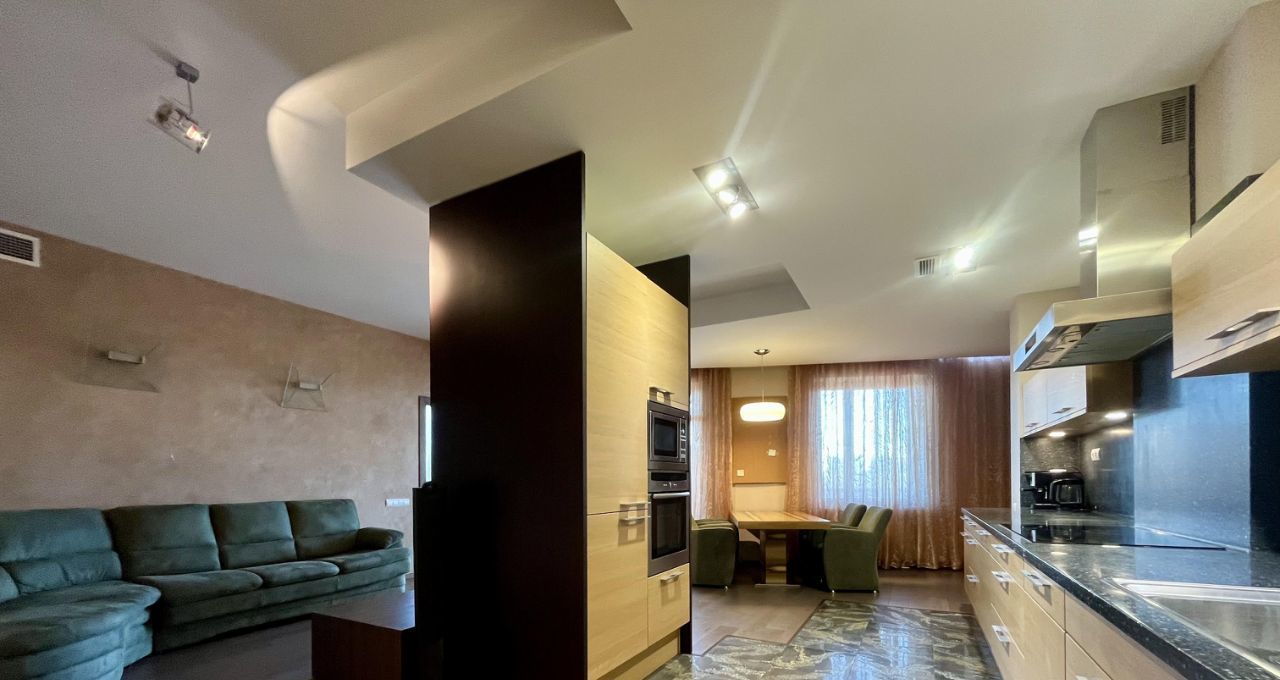 В гостиной установлен телевизор и удобный диван, а также обеденный стол с креслами. Из окон открывается вид на городские пейзажи. В спальне большая кровать и вместительные шкафы и оборудованная гардеробная.