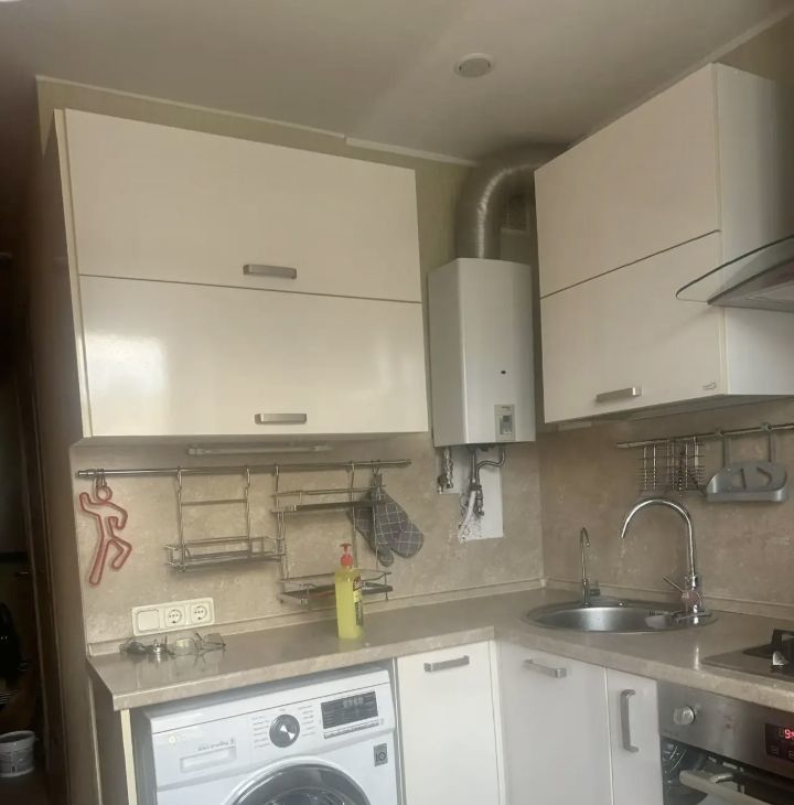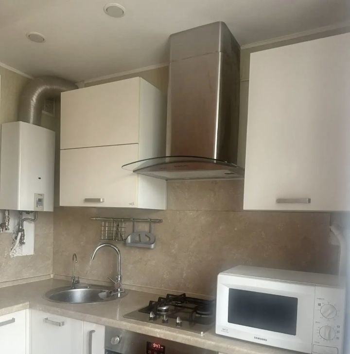 На кухне имеется техника для приготовления еды: духовой шкаф., газовая поверхность и вытяжка. А также расположена современная газовая колонка автомат.