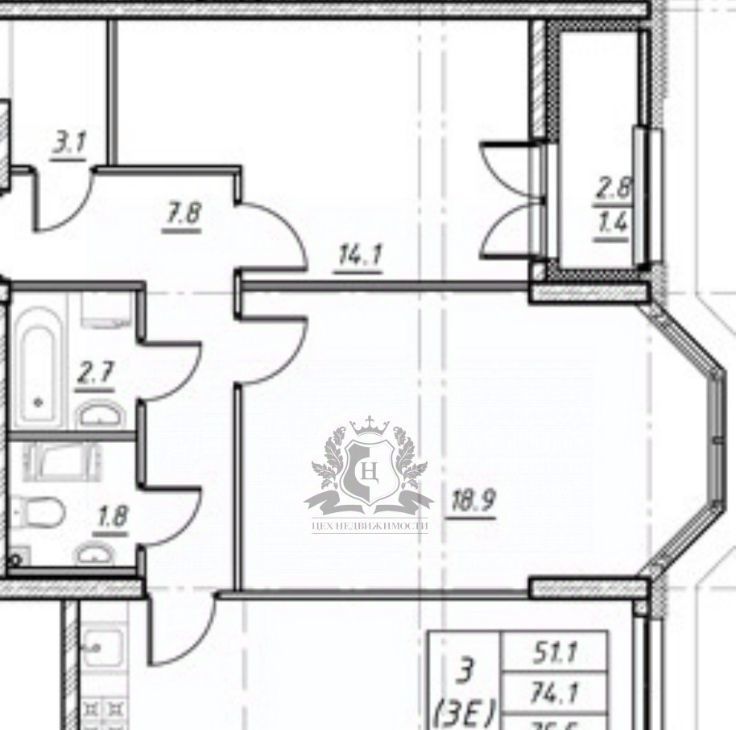 Арт. 75418844 Сдаётся евро-трехкомнатная квартира с просторной кухней-гостиной 25,7м и гардеробной 3,1м.