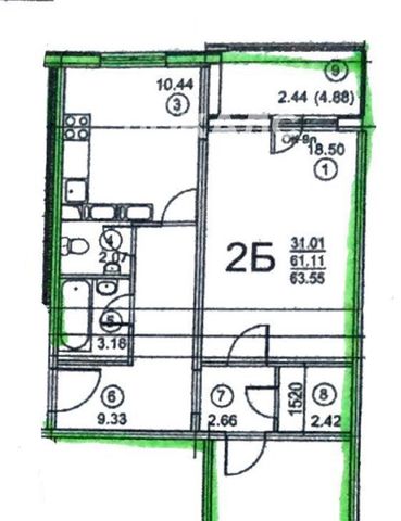 Общая площадь 61 кв. м. Кухня - 10,4 кв.м. Комнаты: 18,5 и 12,5 кв.м. Лоджия 5 кв.м. Гардеробная 2,4 кв.м. Высота потолков - 2,8 м. В доме 2 лифта: грузовой и пассажирский.
