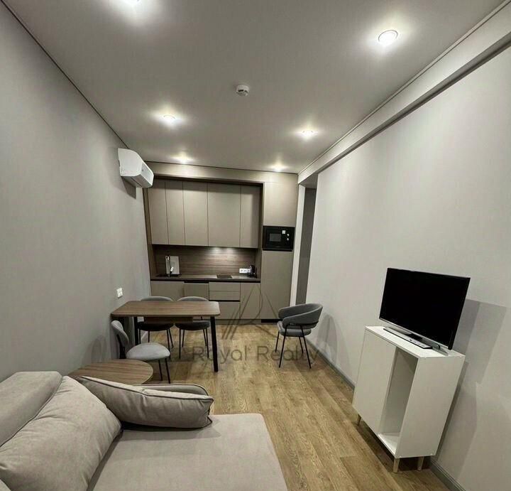 Апартаменты с продуманным зонированием: выделена обеденная зона с необходимой техникой и мебелью, удобное рабочее пространство и зона отдыха с двуспальной кроватью и раскладным диваном. Идеально подходят как для жизни, так и для работы.