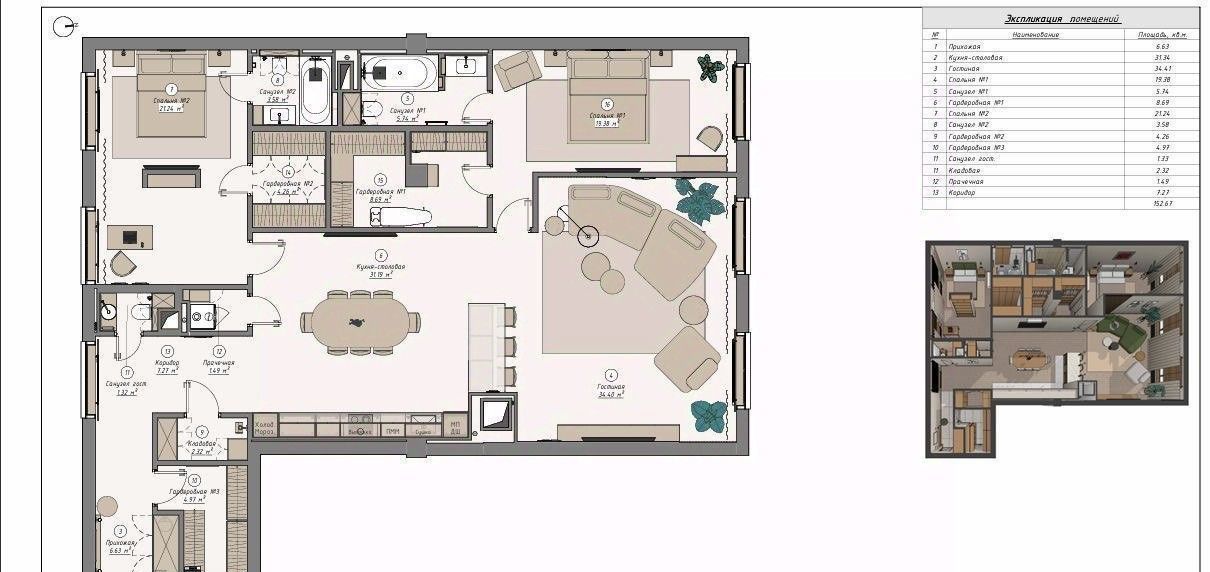Квартира оснащена всей необходимой мебелью и техникой. Есть отличные места хранения, а также дополнительно - 3 гардеробные, отдельная постирочная, вся необходимая мебель и техника, в том числе сушильная машина.