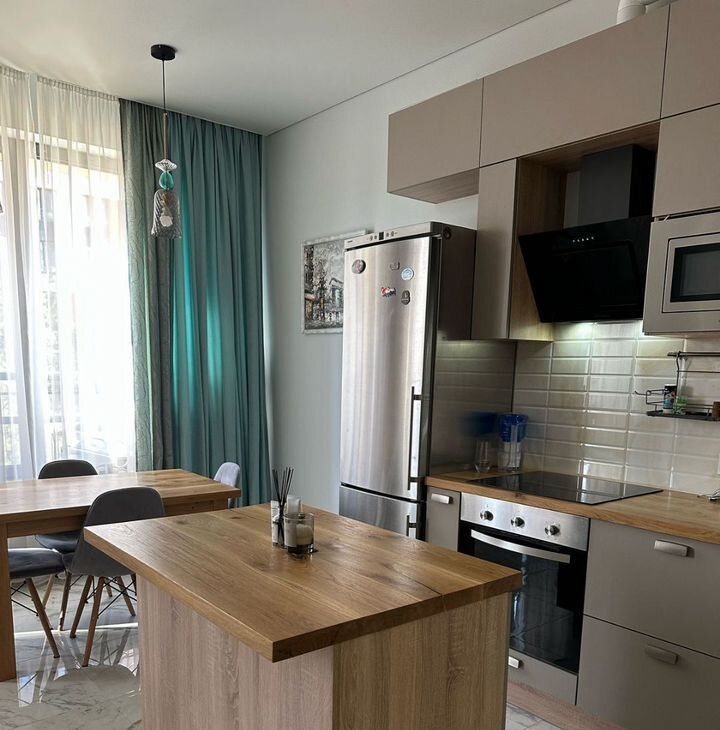 Квартира выполнена в дизайнерском стиле, что обеспечивает современный и комфортный интерьер. В ней есть все необходимое для комфортного проживания: холодильник, посудомоечная машина, телевизор и стиральная машина. Просторная ванная комната и продуманная планировка позволят вам чувствовать себя как дома с первых минут.