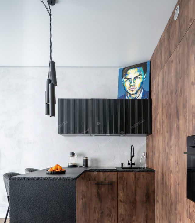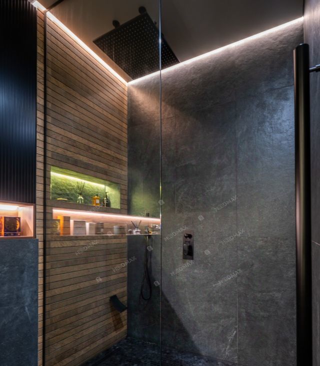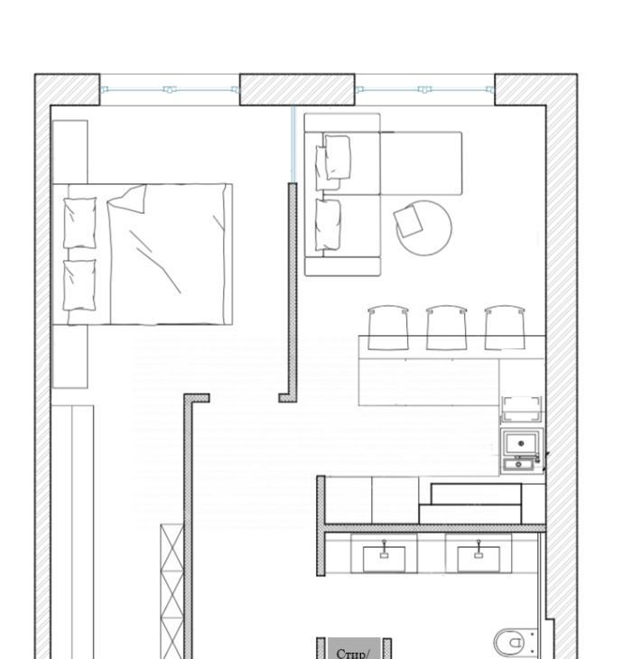 Планировка включает: Спальню с гардеробом, большой объединенный санузел с тропическим душем, и кухней-гостиной.