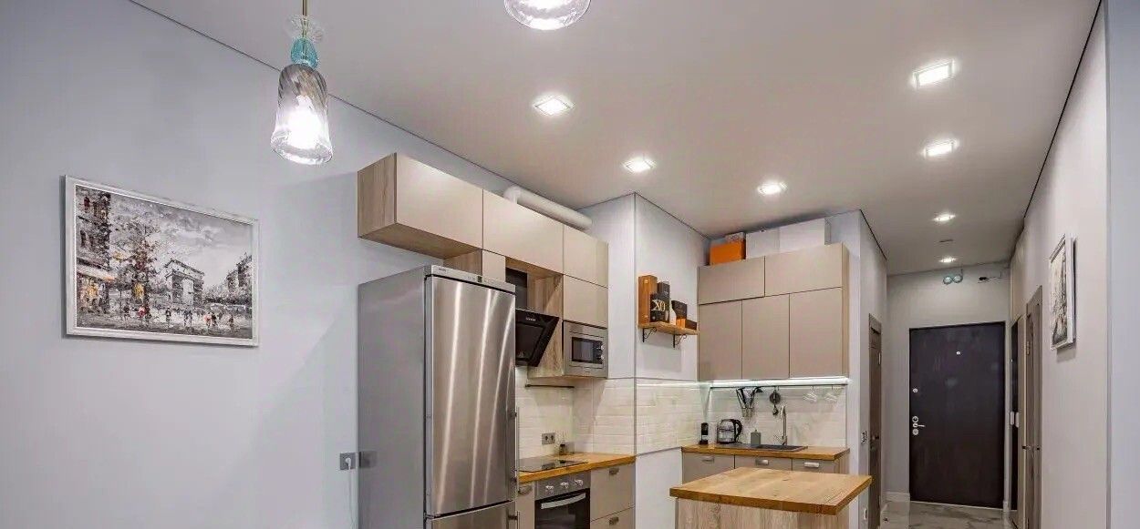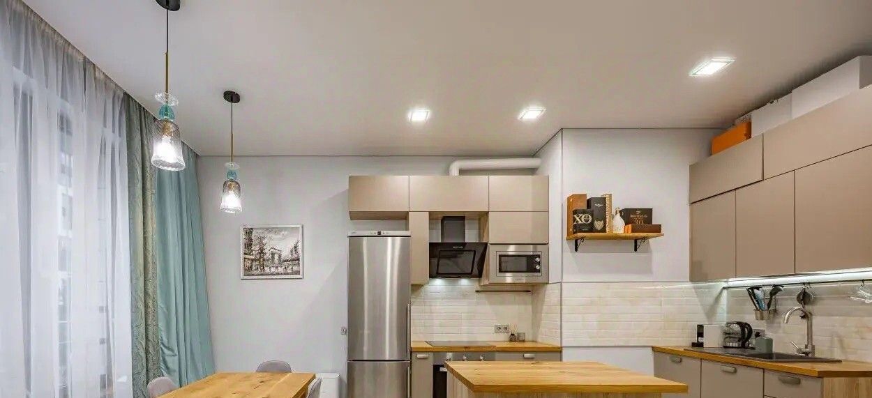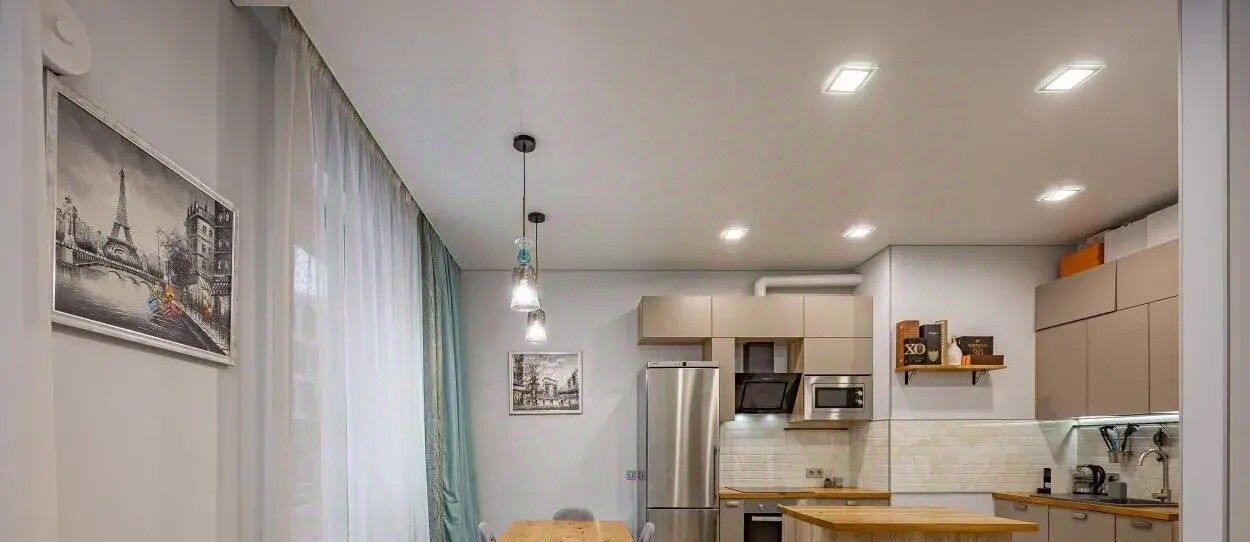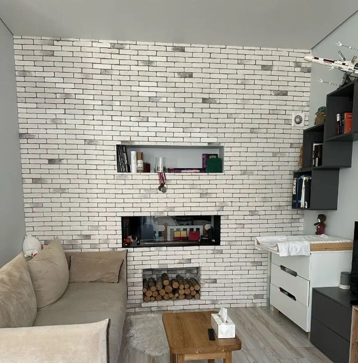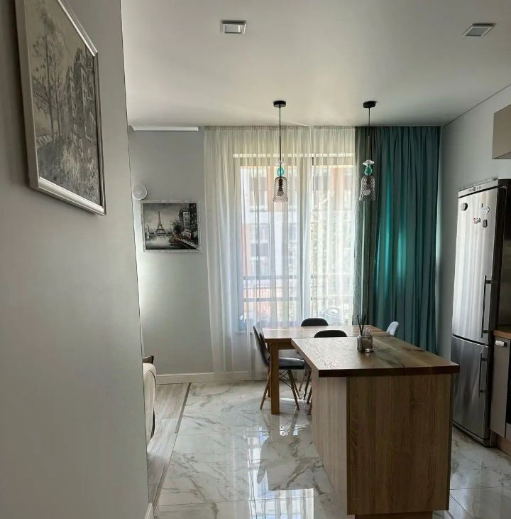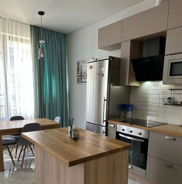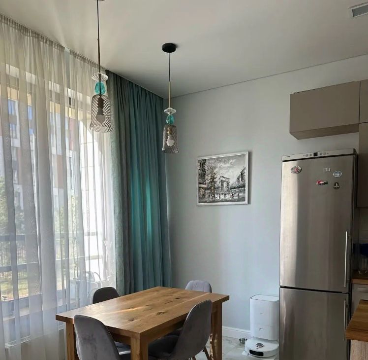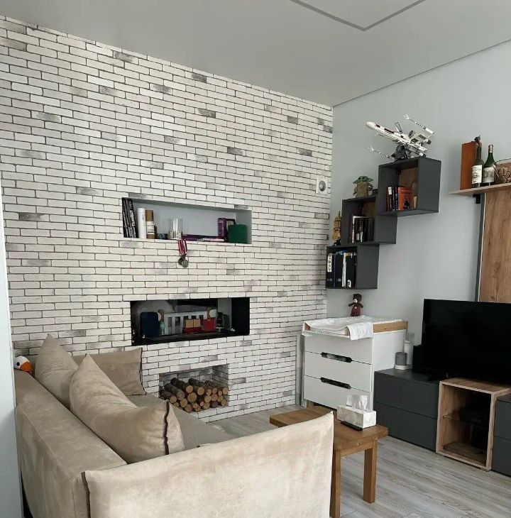 В квартире очень уютная и светлая кухня-столовая, гостиная с комфортным раскладными диваном, с которого приятно вечерами наблюдать за живым огнём в камине. Кухонная зона очень удобна и имеет всю необходимую технику.