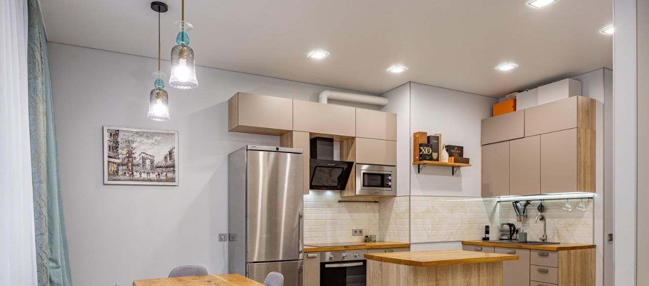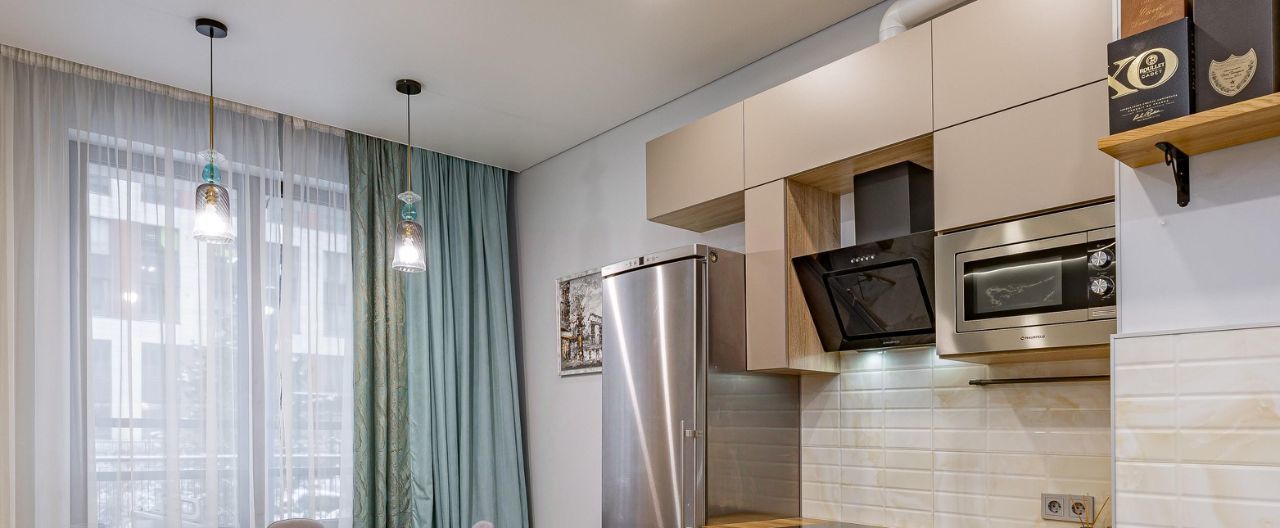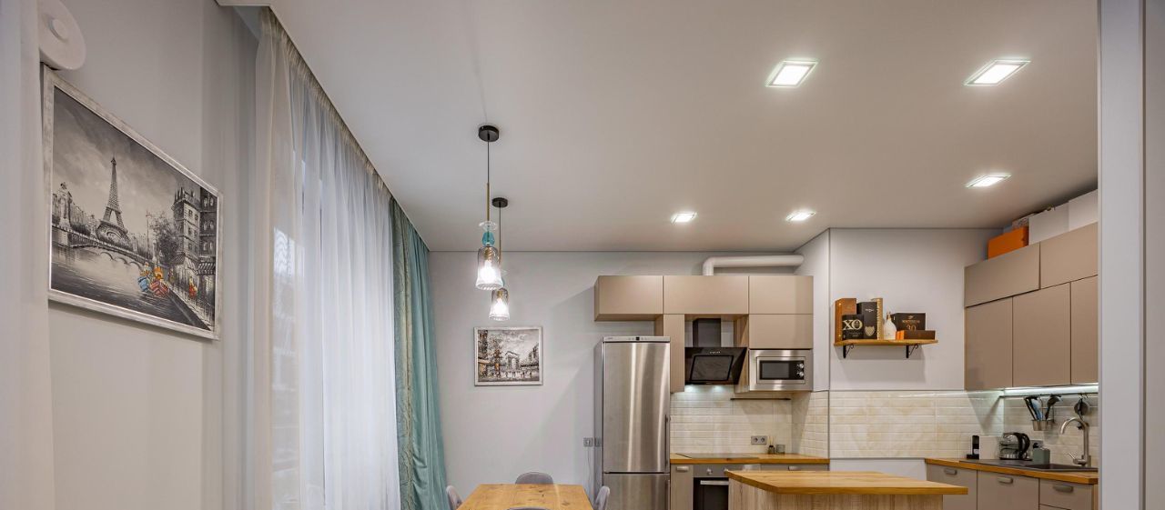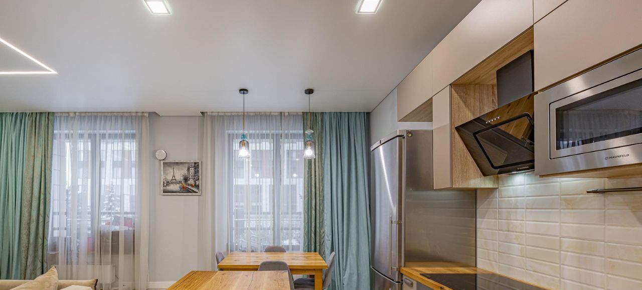 В квартире очень уютная и светлая кухня-столовая, гостиная с комфортным раскладными диваном, с которого приятно вечерами наблюдать за живым огнём в камине. Кухонная зона очень удобна и имеет всю необходимую технику.