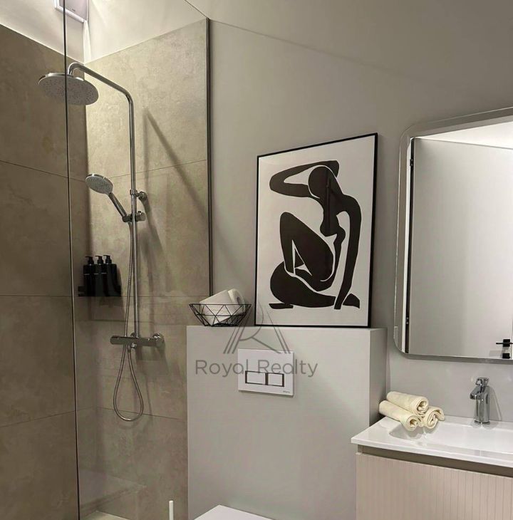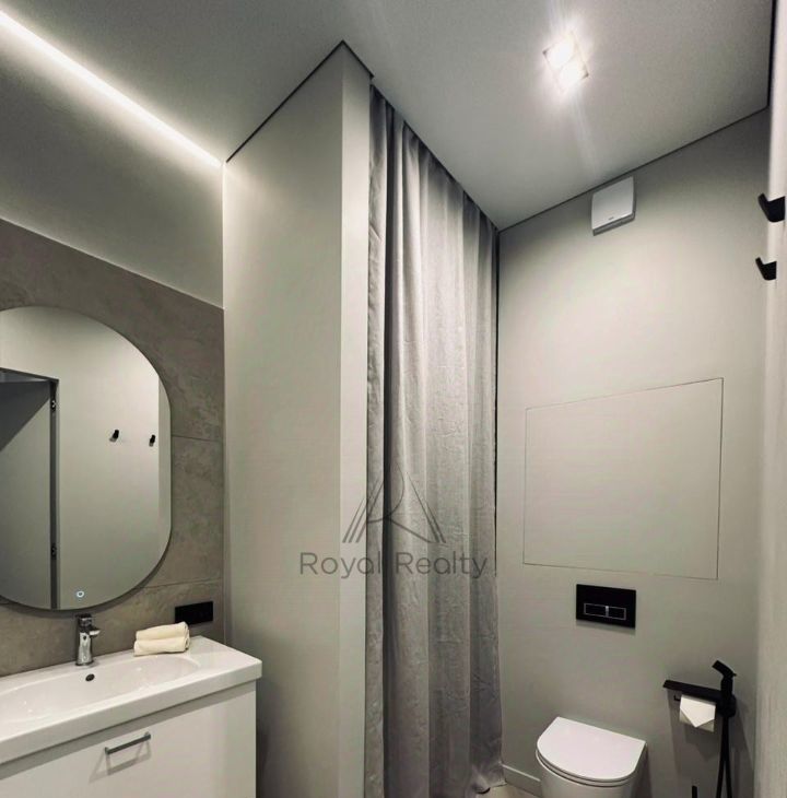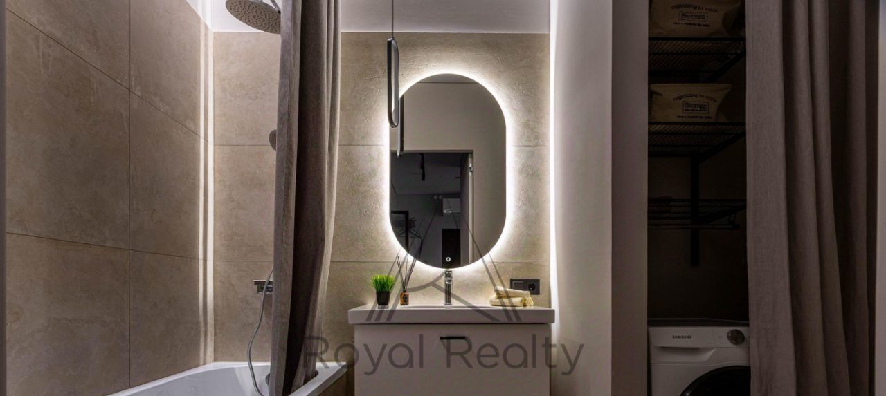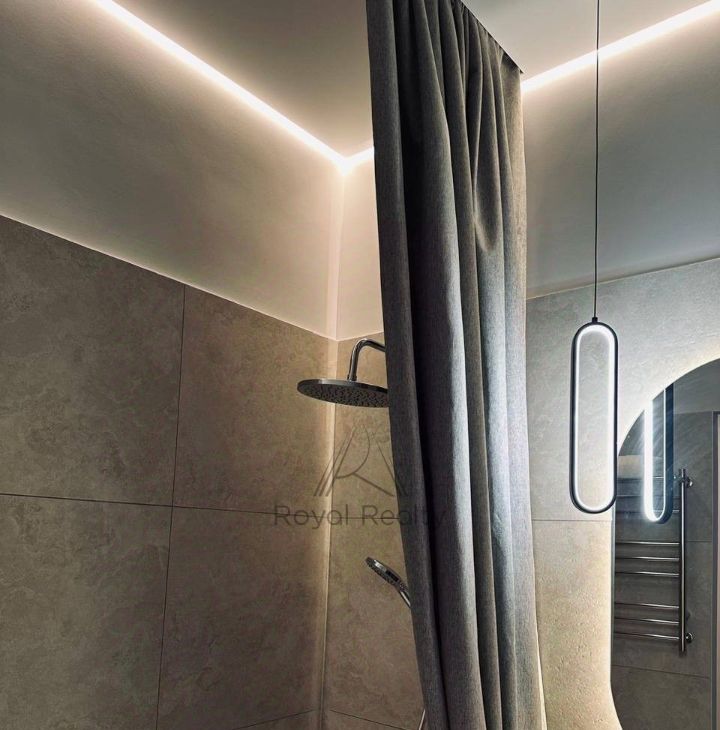 Квартира полностью меблирована, теплые полы в ванных комнатах и прихожей, высокие межкомнатные двери; телевизор и стирально сушильная машина Samsung, кондиционер, приточно вытяжная вентиляция. Текстиль из натуральных материалов, льняные шторы.