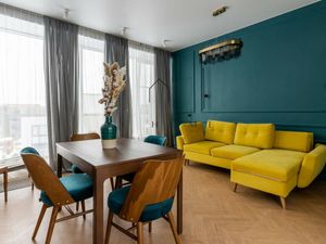 Квартира полностью оборудована мебелью, всей необходимой техникой высокого класса, большим количеством зон хранения .