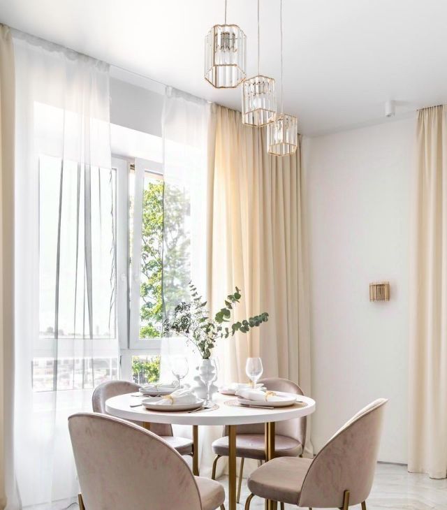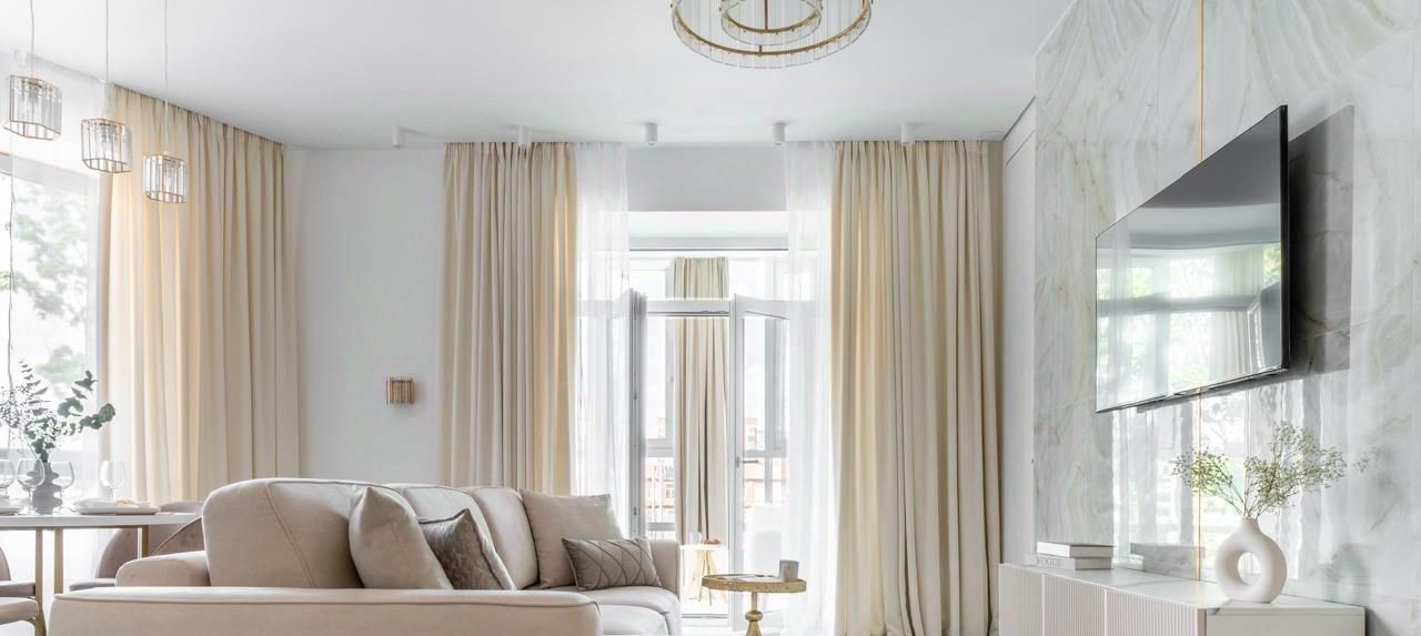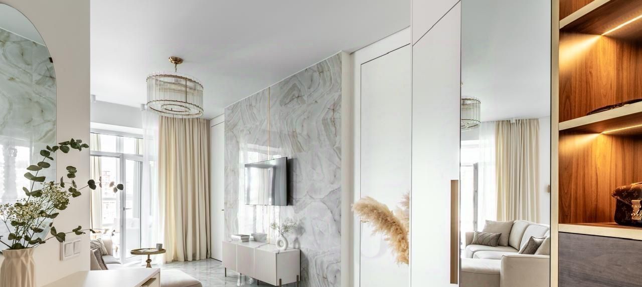 Просторная кухня-гостиная, выполненная в светлых тонах