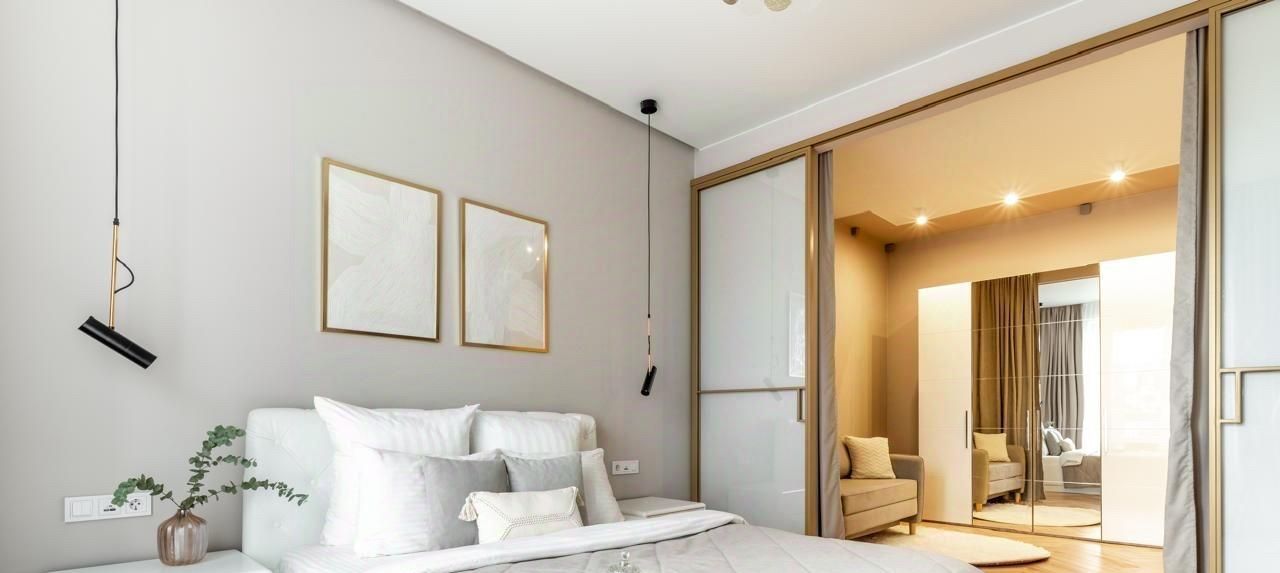 Две спальни: 1 - с двуспальной кроватью, 2 - раскладывающимся диваном, можно заменить на кровать при необходимости. Между спальнями раздвижная перегородка.