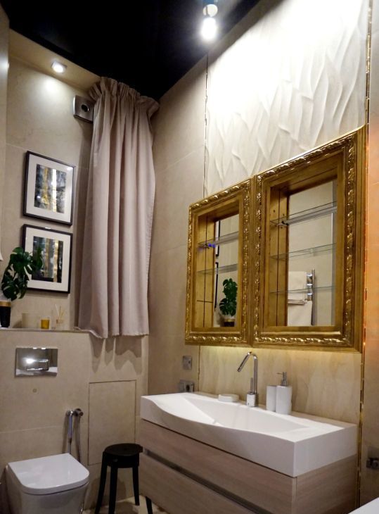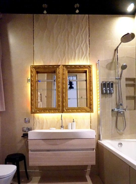 *Стильная ванная комната с концепцией spa подсветкой хромотерапией ,теплым полом , романтичным окном в ванной позволяет смотреть ТВ из гостиной и пропускает дневной свет